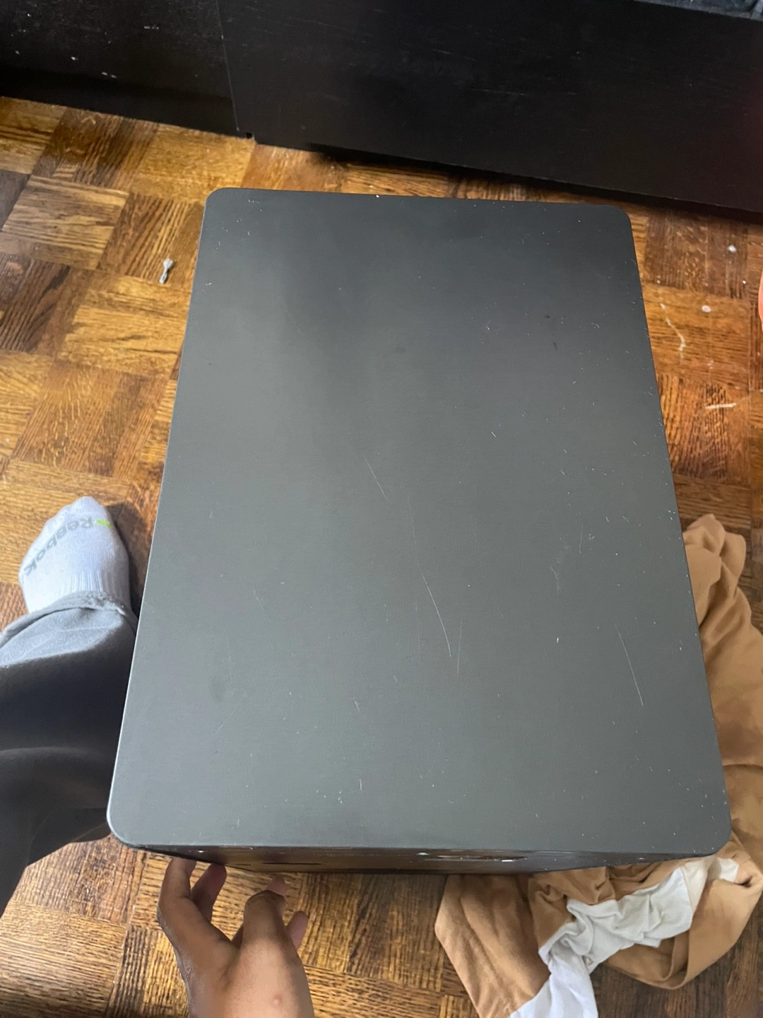 A rectangular black subwoofer. It has a woofer port on the bottom of it. There are several air vents on it too. Perfect for listening to some music after a long day.
