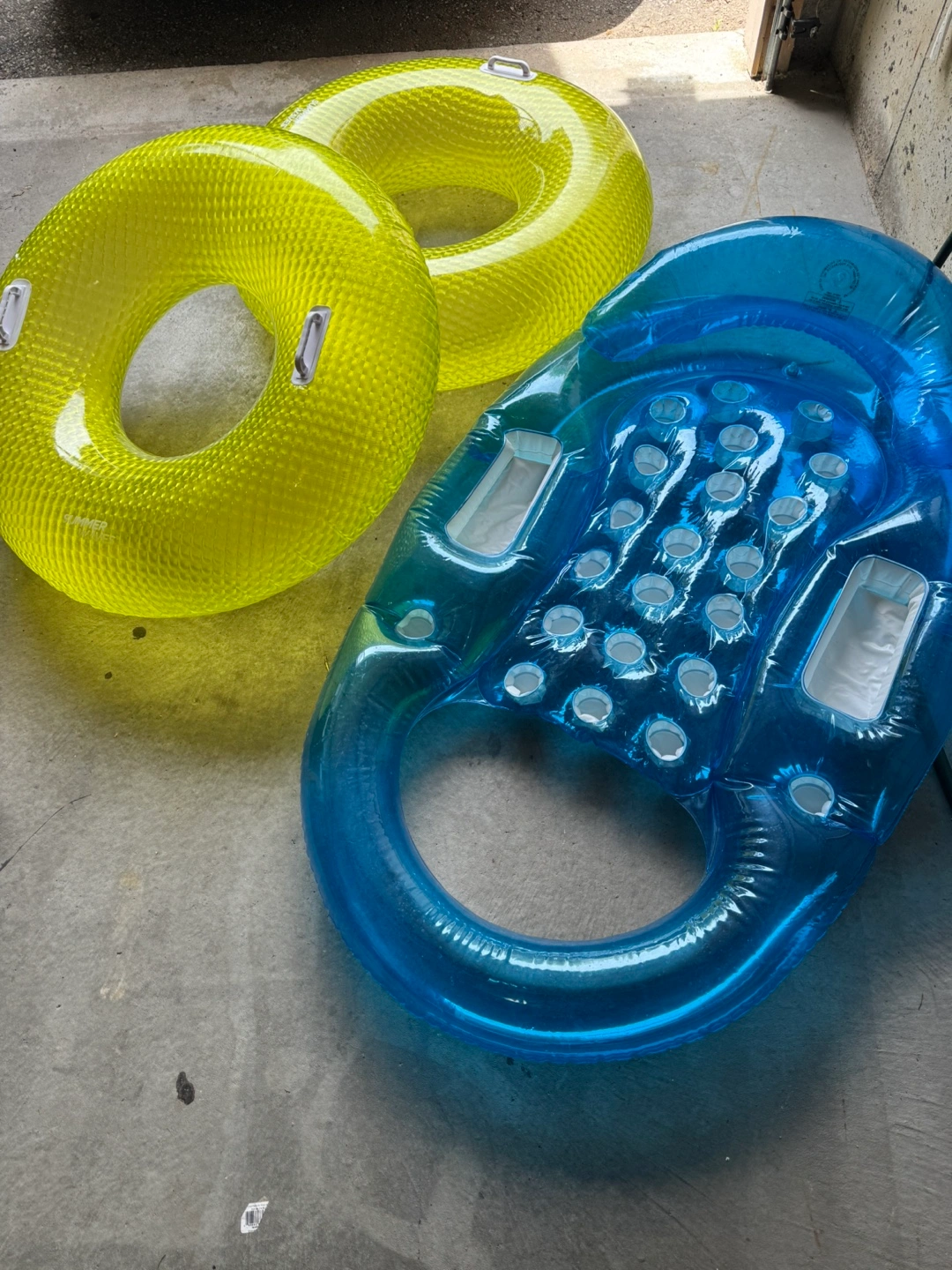 There are two yellow pool tubes. One blue lounge chair shaped float. There are handles on the tube floats. A relaxing way to enjoy the sunshine.