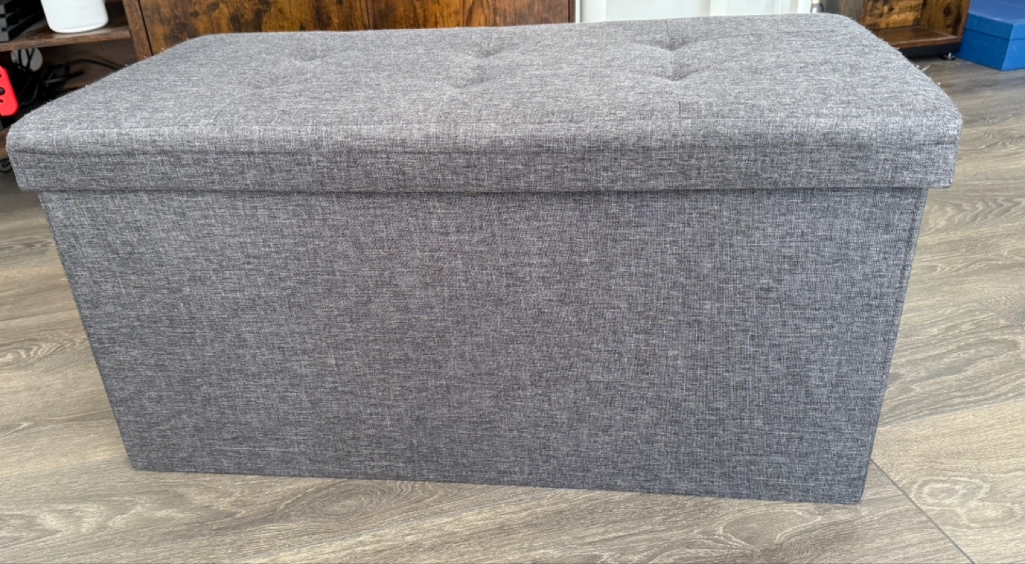 A rectangle shaped ottoman. Upholstered in grey fabric. The top is tufted. A great spot to cozy up with a good book. The top opens to reveal storage space.