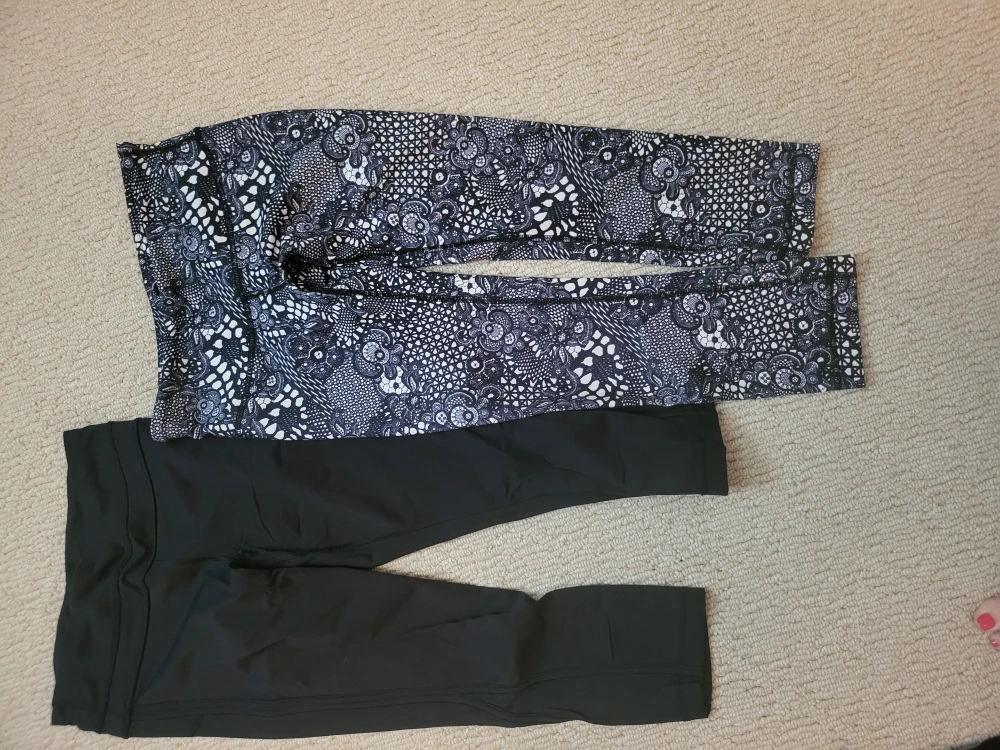 A pair of black activewear leggings. Another pair features a unique pattern in black and white. A perfect set for your next workout.