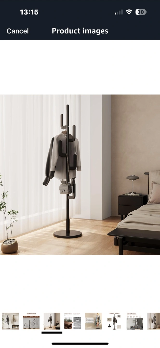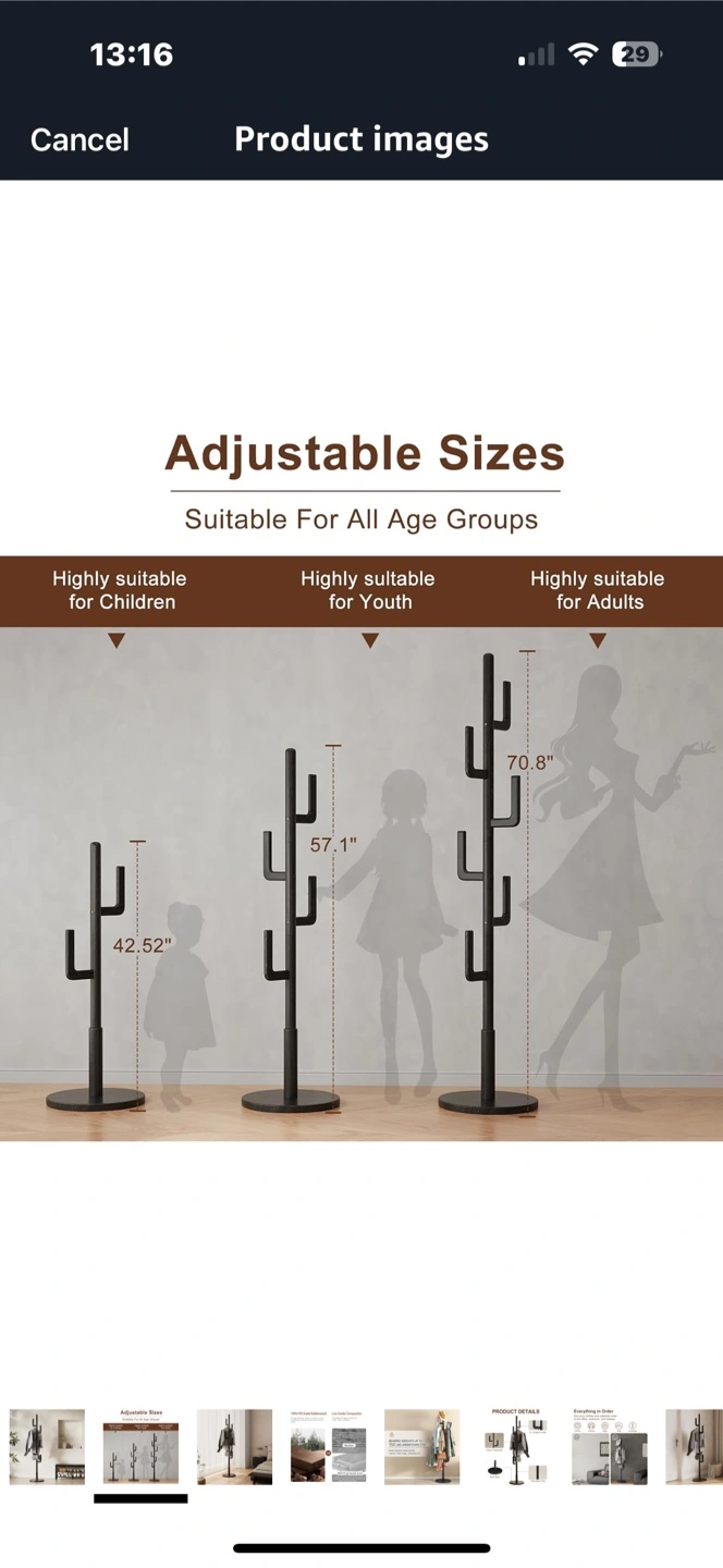 A sleek, modern coat rack. Features multiple arms for hanging garments. Constructed from metal. Adds a touch of style to any space and will keep your items organized for a relaxing experience at home.