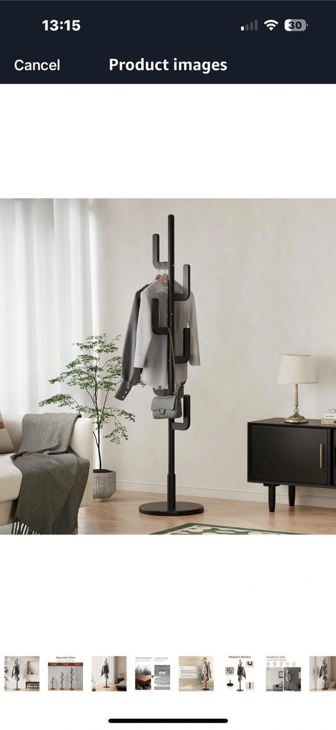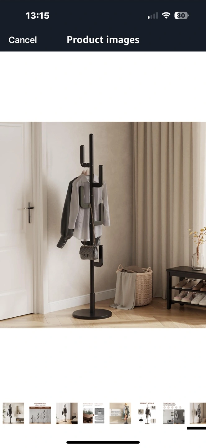 A sleek, modern coat rack. Features multiple arms for hanging garments. Constructed from metal. Adds a touch of style to any space and will keep your items organized for a relaxing experience at home.