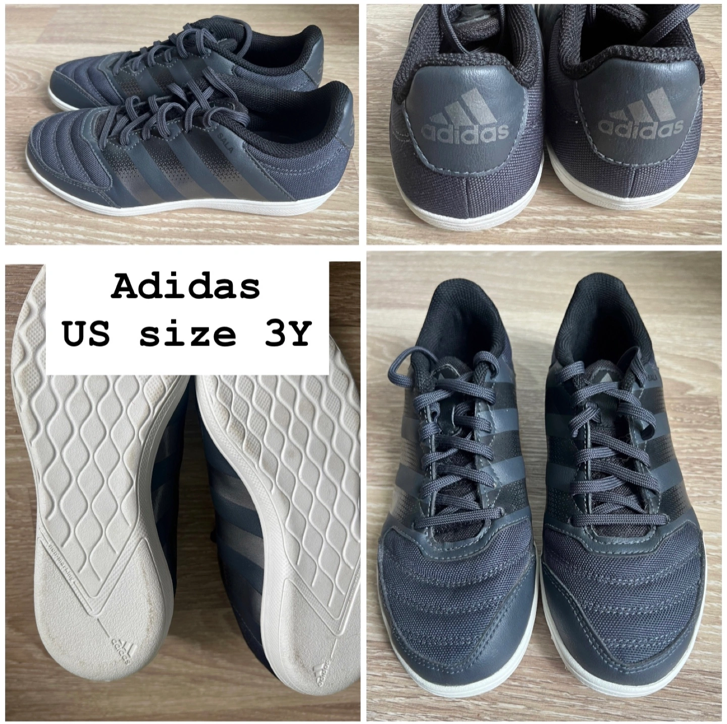 A pair of dark grey Adidas sneakers. They have white soles. Perfect for casual wear, providing comfort for everyday activities.