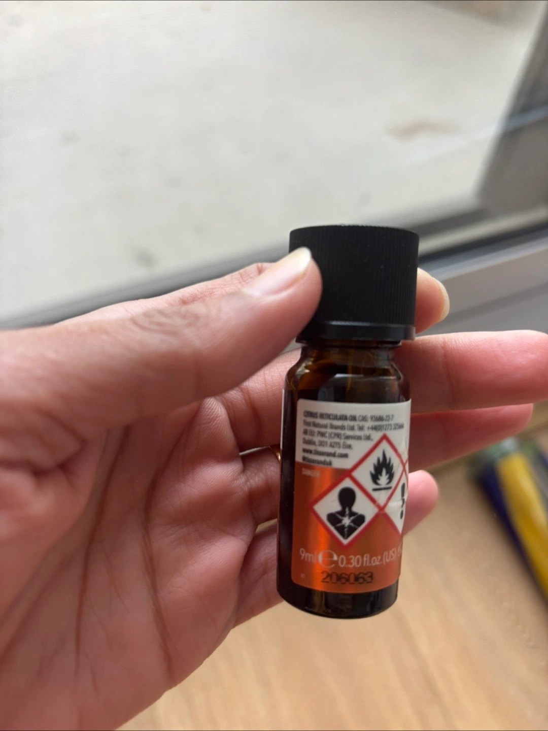 A small bottle of essential oil. The oil has a tangerine scent. It is contained in a dark glass bottle with a black lid. You can use this to help you find your inner peace.