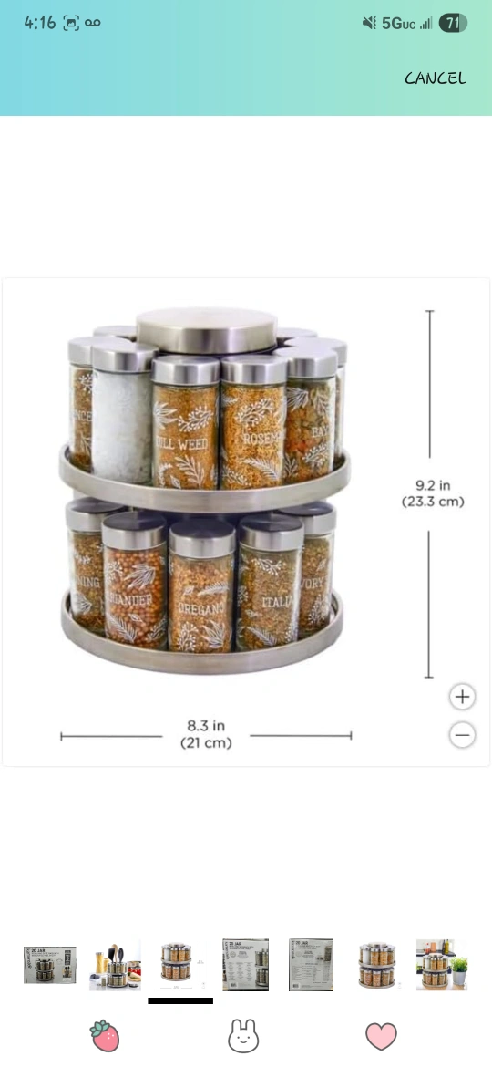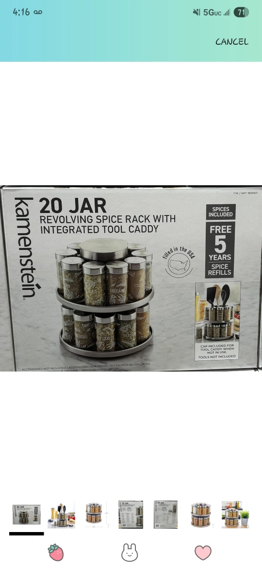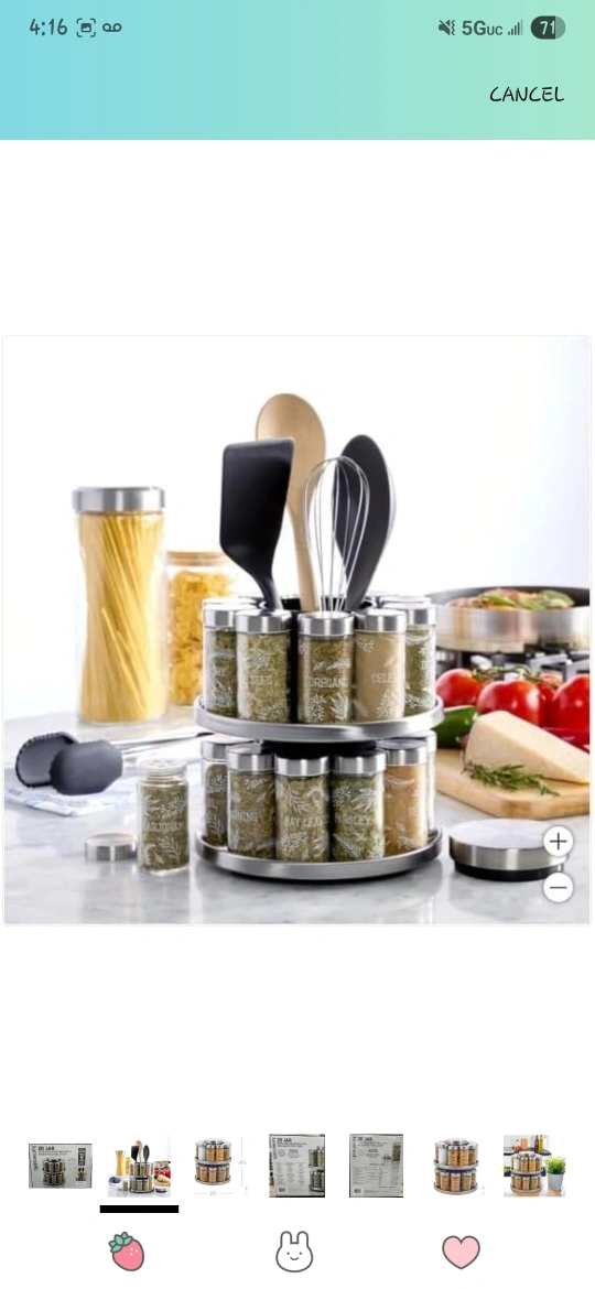 Spice rack with multiple jars. It comes with a rotating rack and a tool caddy. This spice rack is a perfect addition to any kitchen, providing a calming sense of organization to your spice collection.