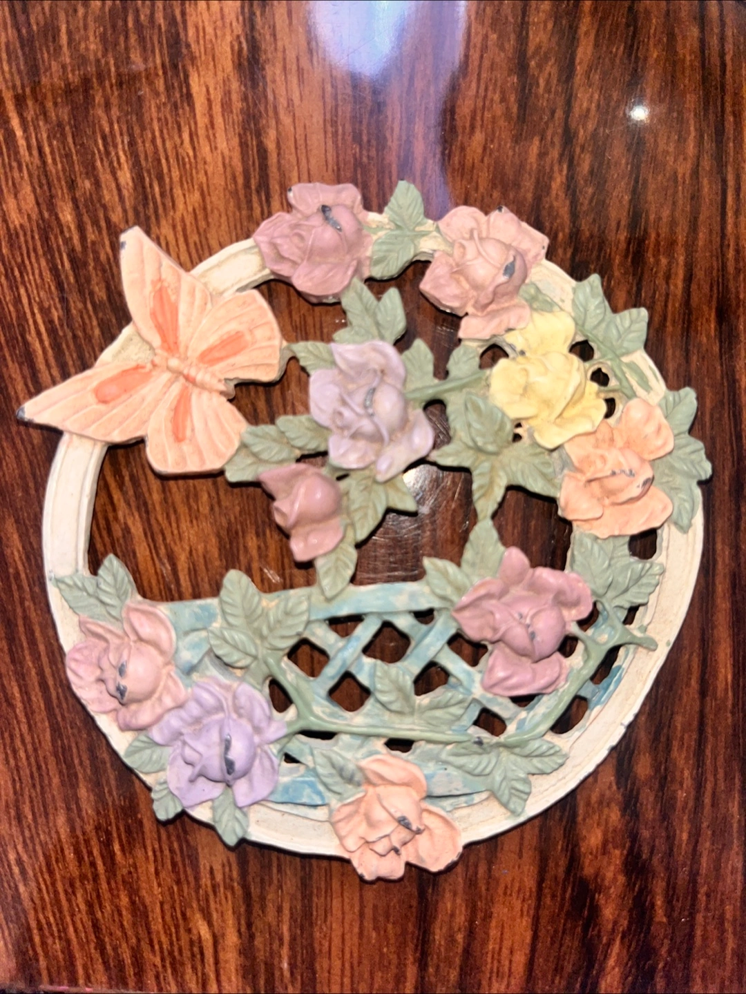 A circular wall decor piece. Features flowers, a butterfly, and a decorative lattice in the middle. The piece has a vintage aesthetic and it will bring a sense of peace to any space.