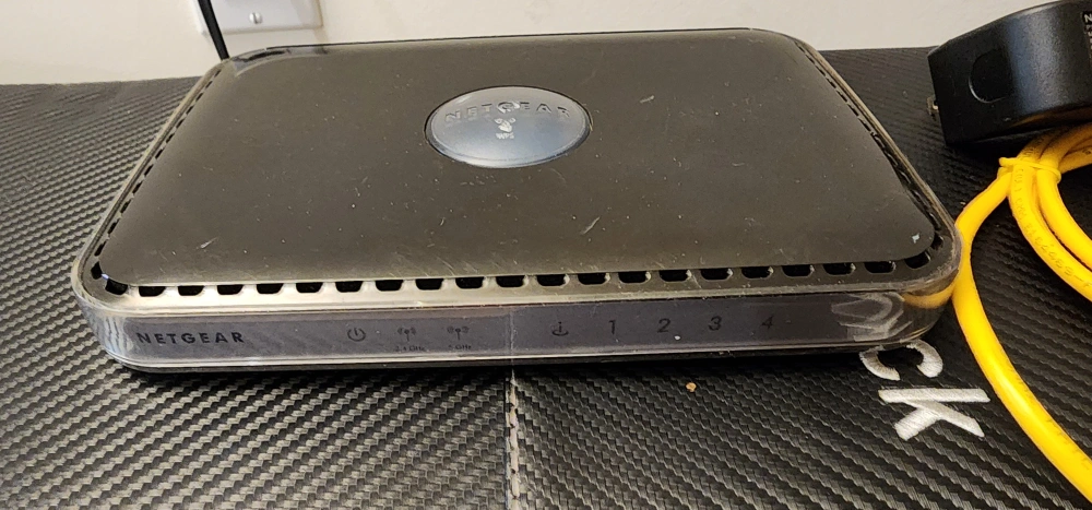 A NETGEAR router. Comes with the router itself, the power adapter, and the Ethernet cable. You can make sure all your devices are connected for a nice and relaxing night in.