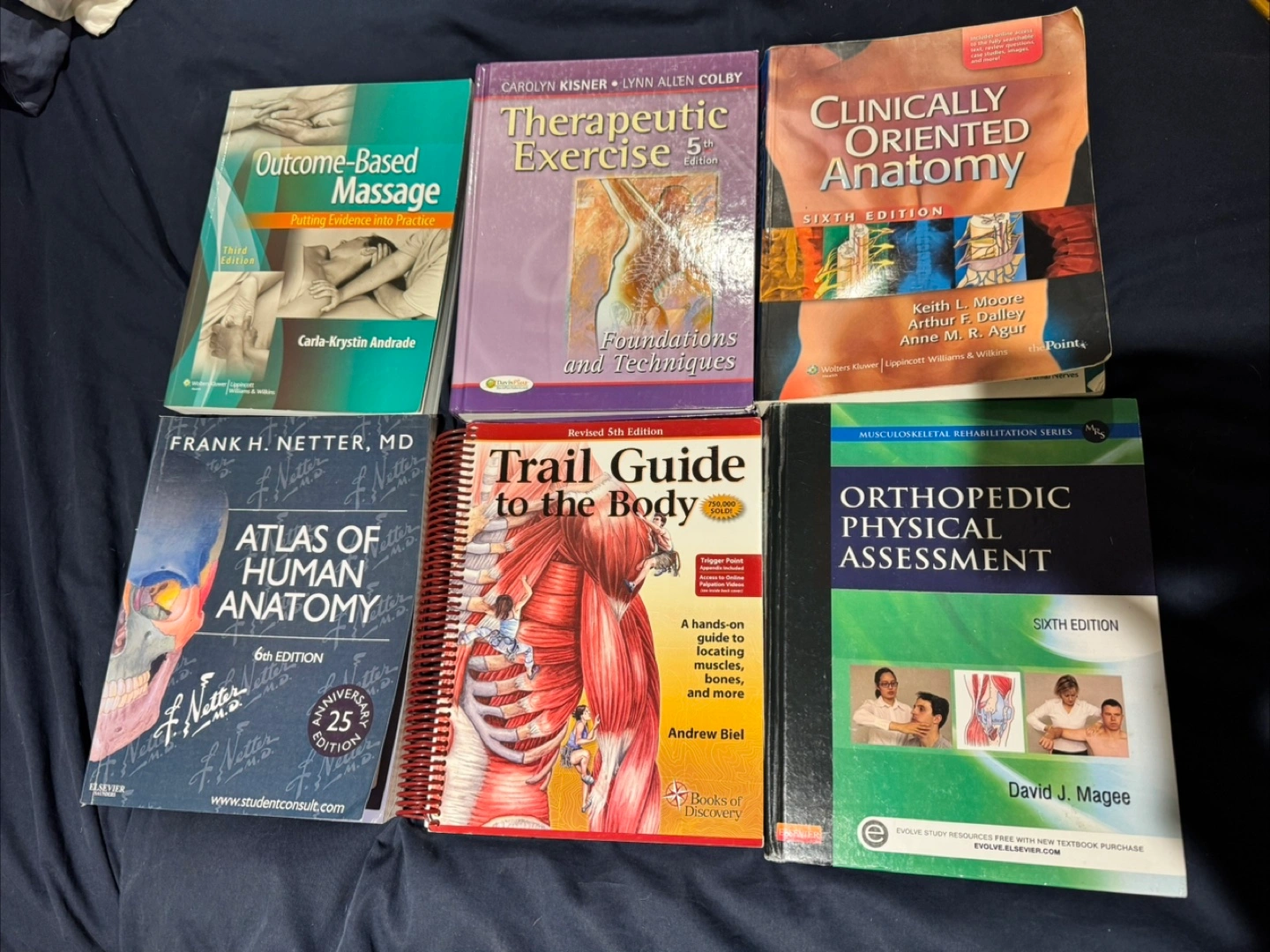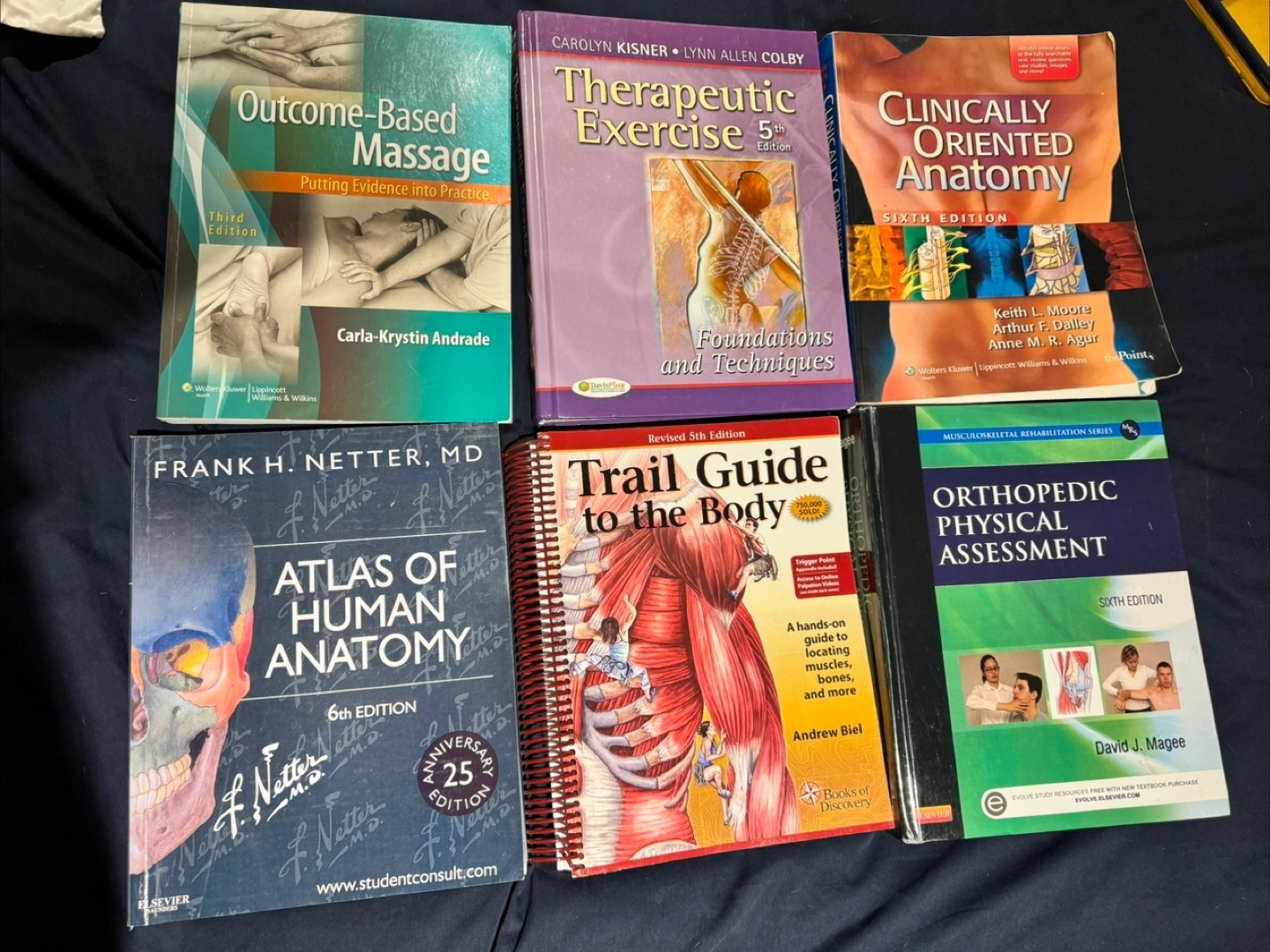Books cover a variety of medical subjects. Some books focus on anatomy, massage, and exercise. These books are perfect for students studying to be an RMT or similar field. $25 each or bundle pricing available.