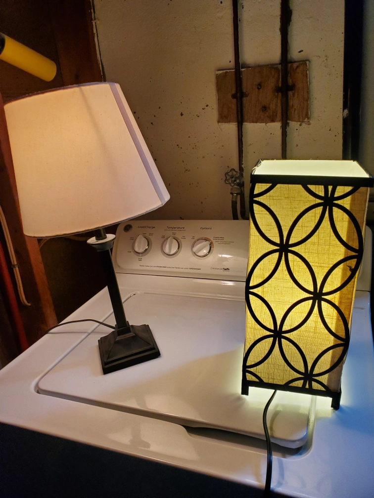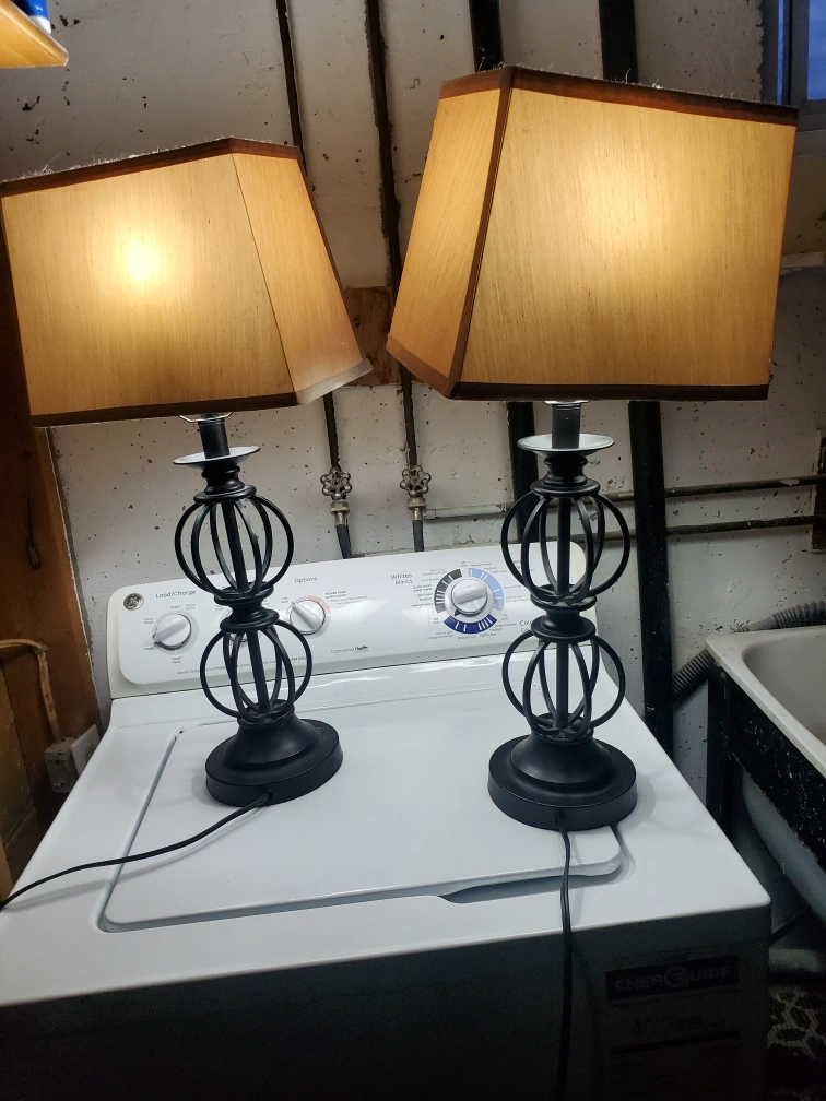83A set of lamps to brighten your space. One lamp with a standard lampshade, and the other with a decorative patterned shade. Perfect for creating a relaxing ambience. 2 Brown table lamps with shades. All lamps $ 5.00 each