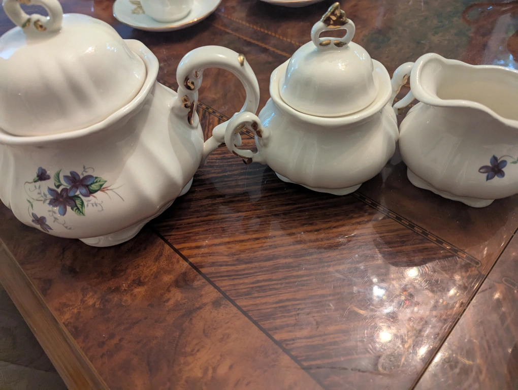 Cream coloured tea set with a charming floral design. A teapot, sugar bowl and a creamer are included. Decorative gold details can be found on the handles and lids. Imagine the pleasure of enjoying a quiet cup of tea with loved ones.