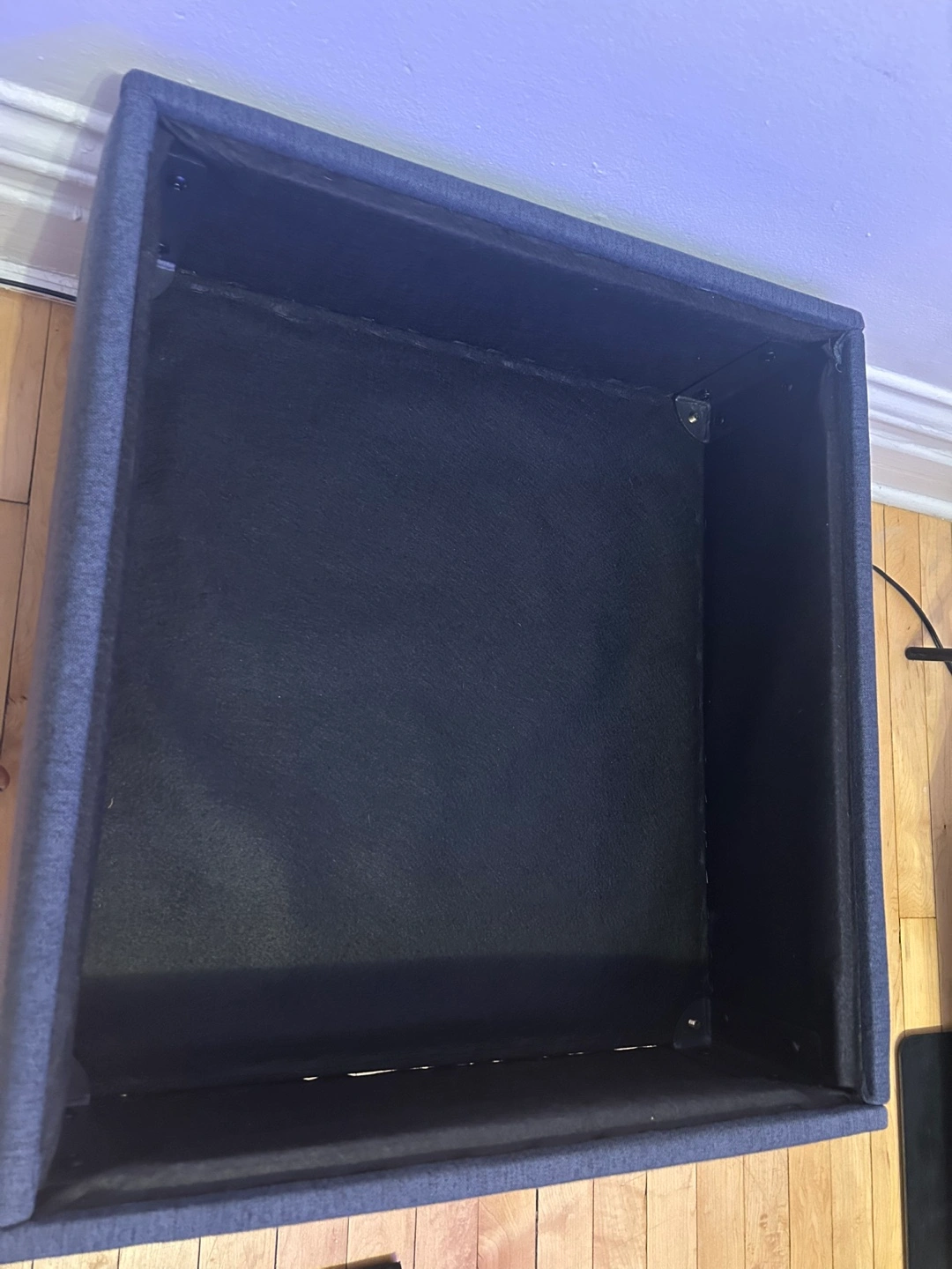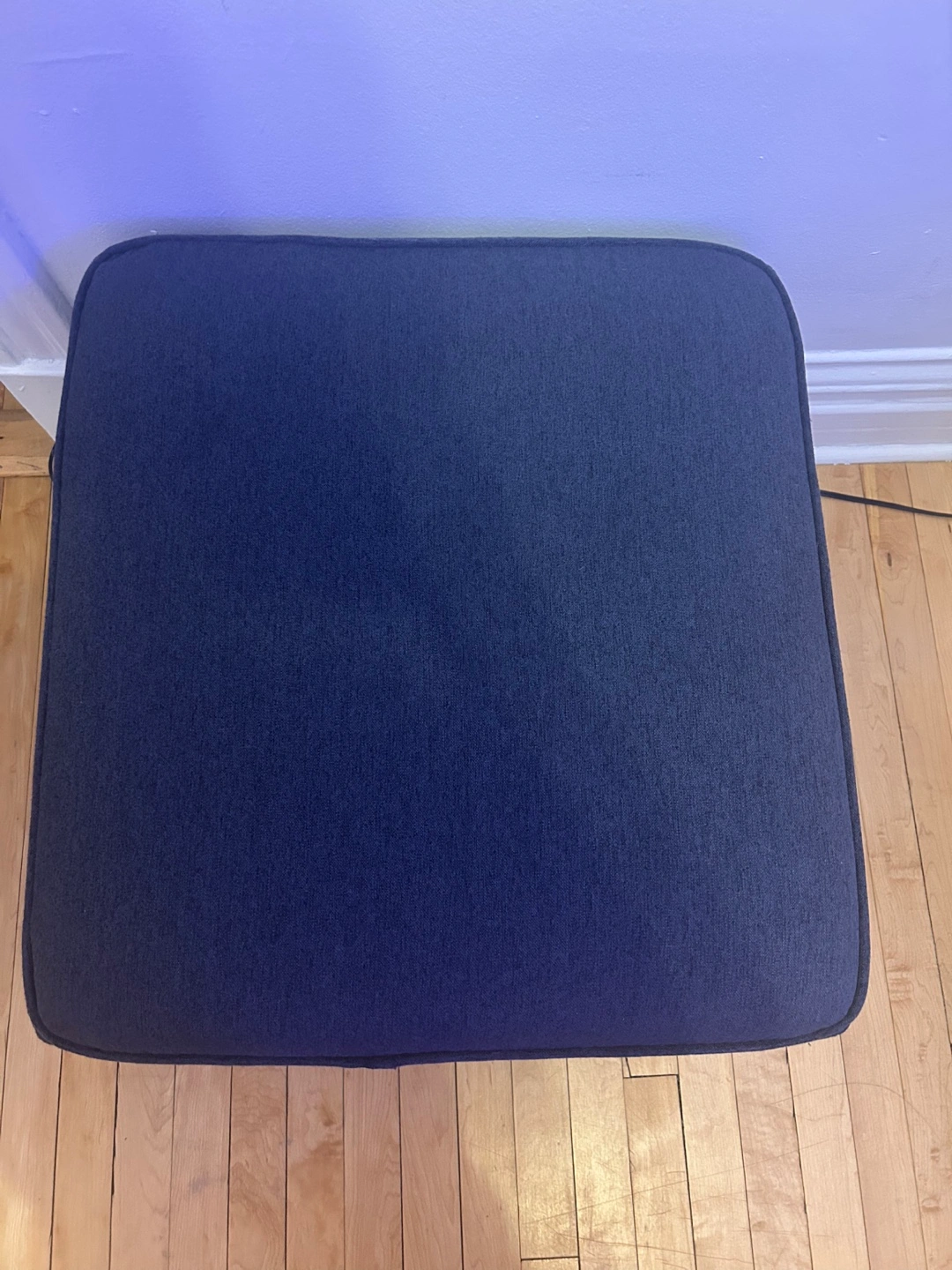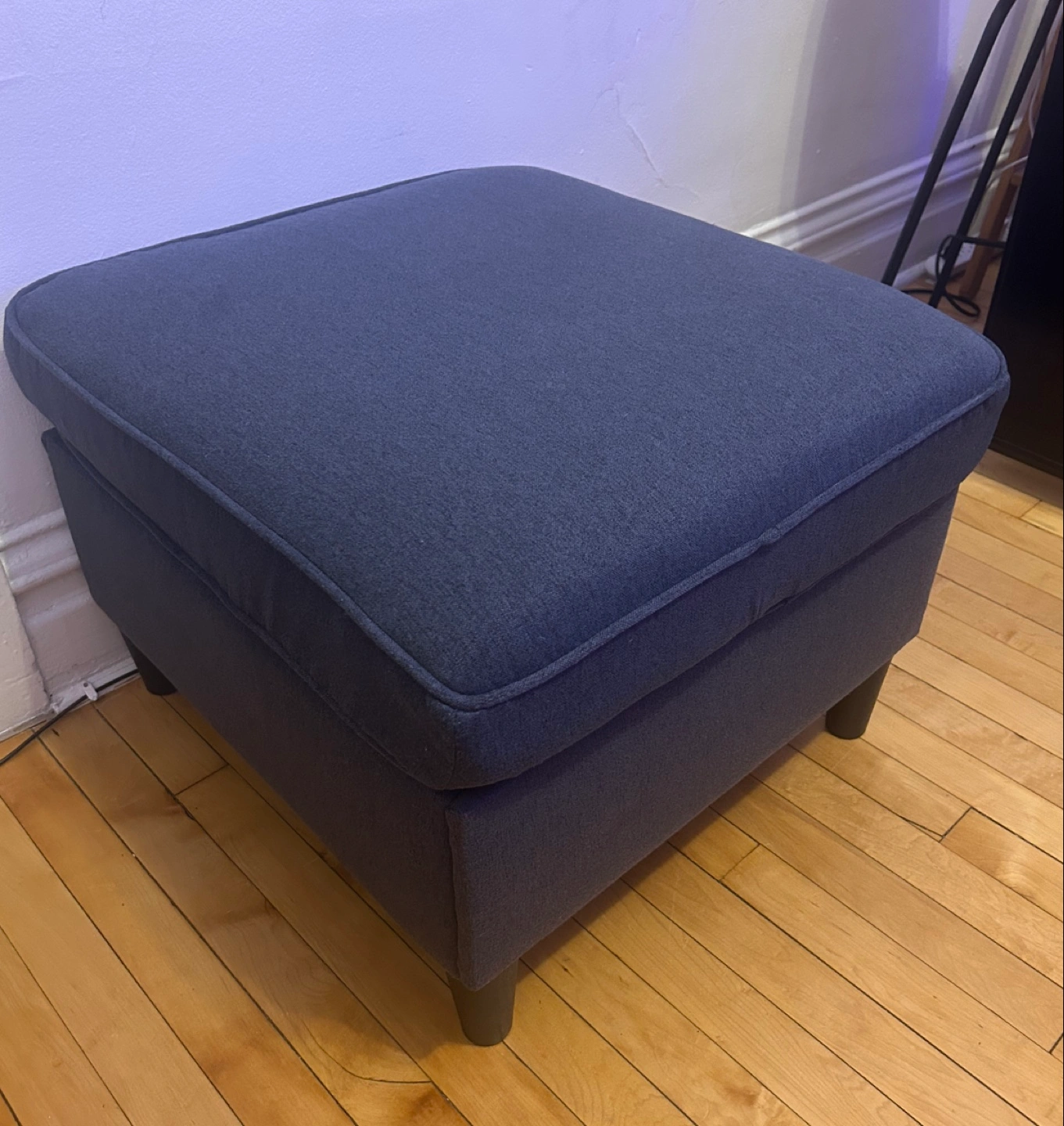 Adorable heathered navy ottoman with ample storage for blankets/games/knick-knacks inside, originally from Bed Bath and Beyond. The feet are a dark, walnut-y wood color. Comfy! Happy to send more photos if needed.