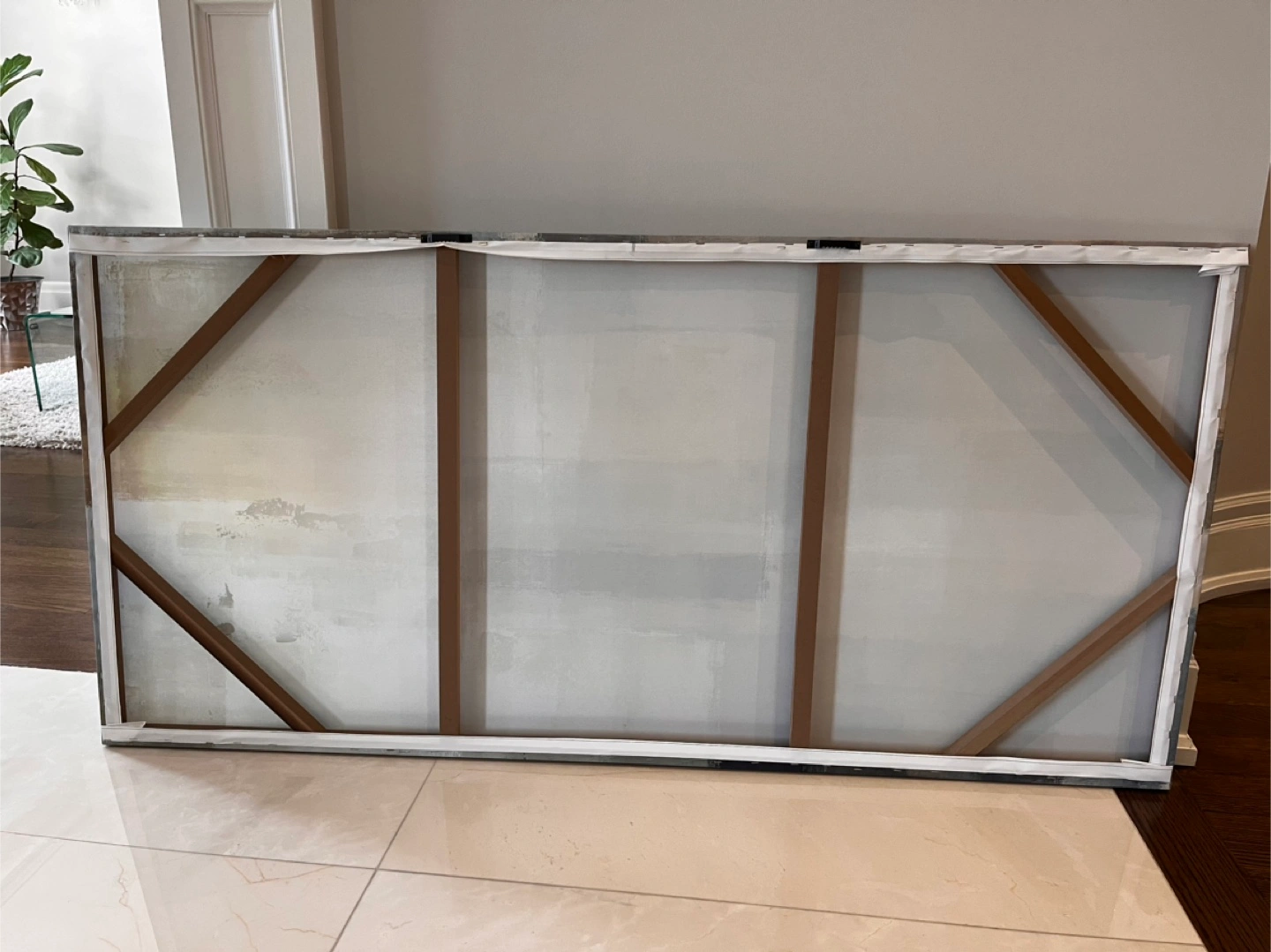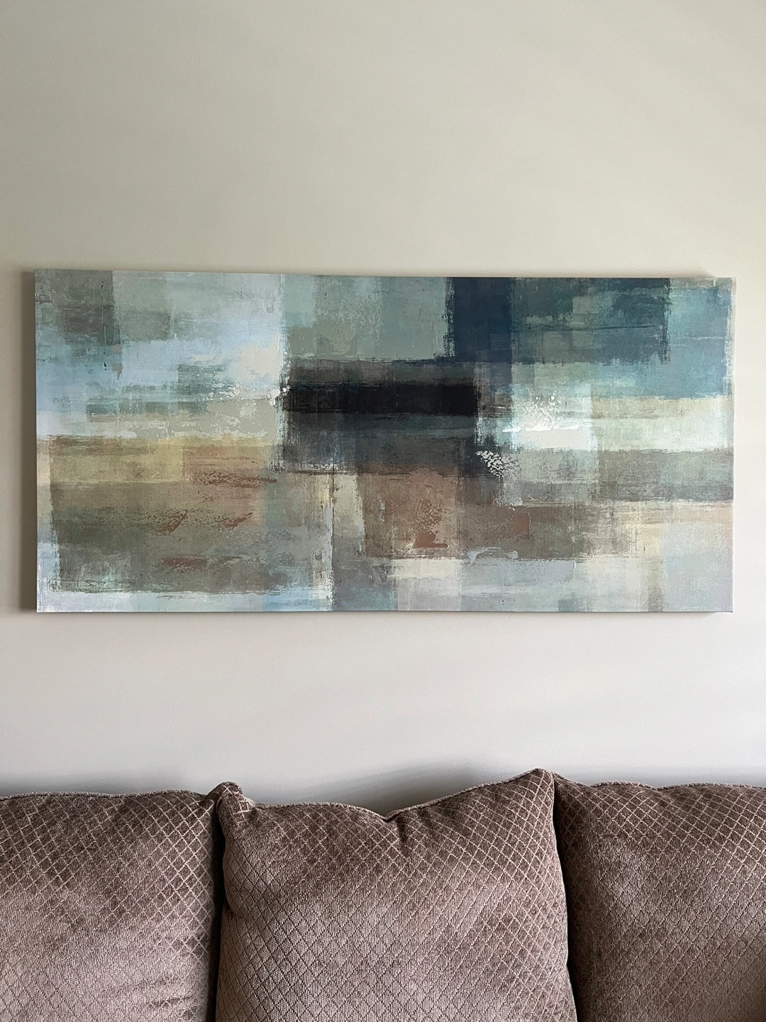 A stunning abstract canvas art piece. Featuring muted tones and a textured design. The back of the canvas has a frame and is ready to hang. This artwork would be a great addition to any living space, helping to create a tranquil atmosphere.