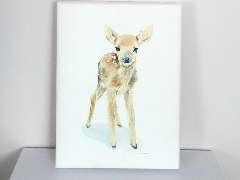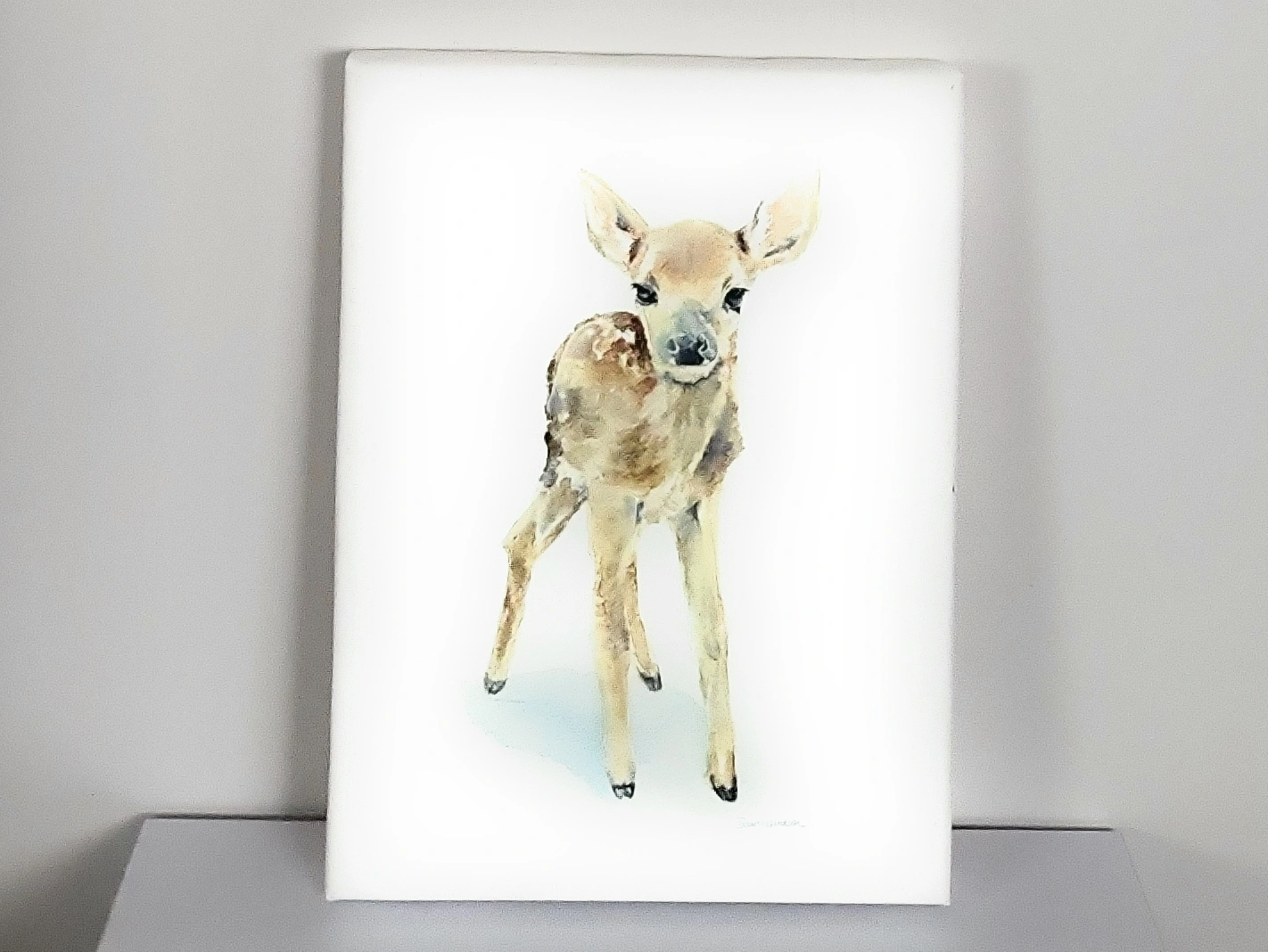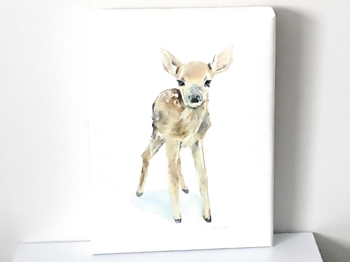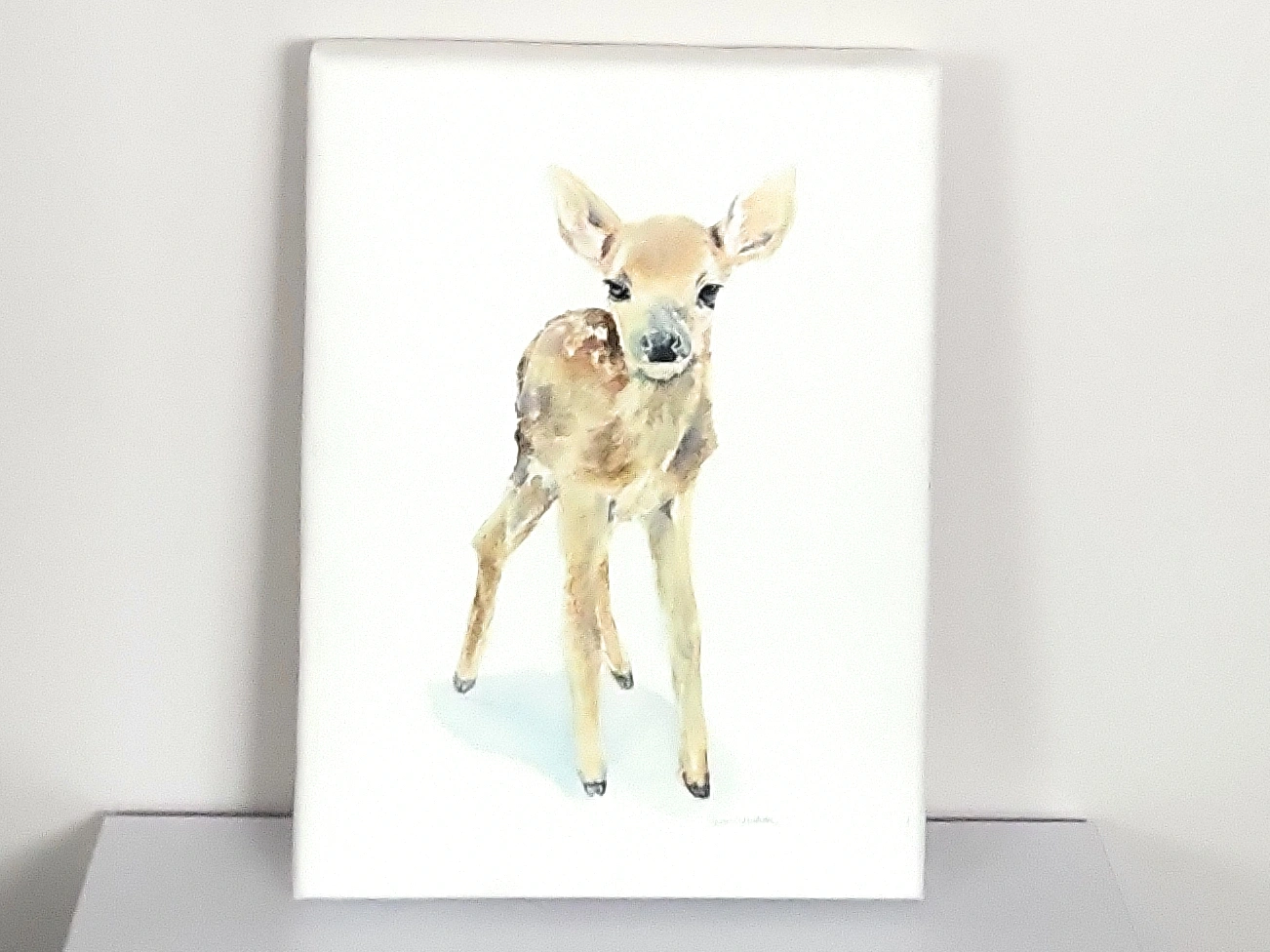 Features a watercolour painting of a baby deer. The canvas is stretched. The back is stapled. It can brighten any room.