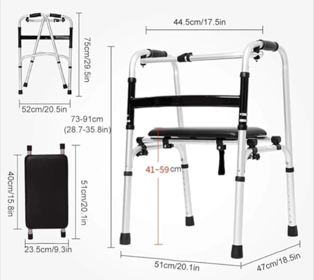 The walker features a seat, offering a place to rest. It has adjustable height and a folding design for easy storage and transport. It's a great help for people who want to move around their home at a comfortable pace.
