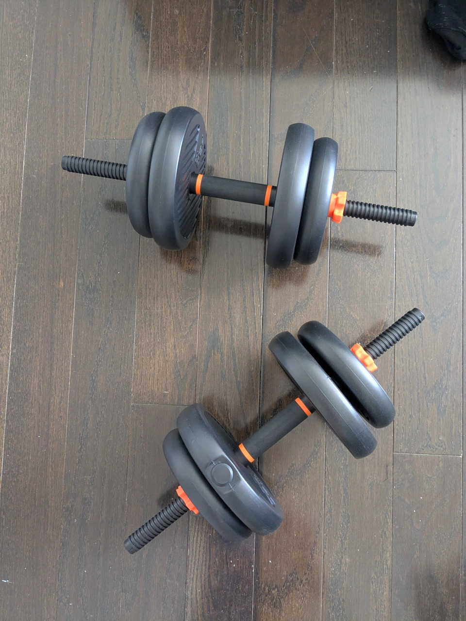 Dumbbell set featuring 90lb of weight plates that can transform into 2x dumbbells, 2x kettlebells OR a barbell with an extension. These would be perfect for incorporating into a workout routine at home.