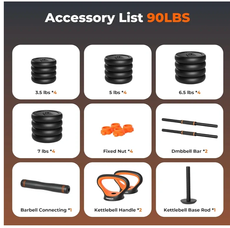90lb Adjustable Dumbbells, Kettlebell, or Barbell set