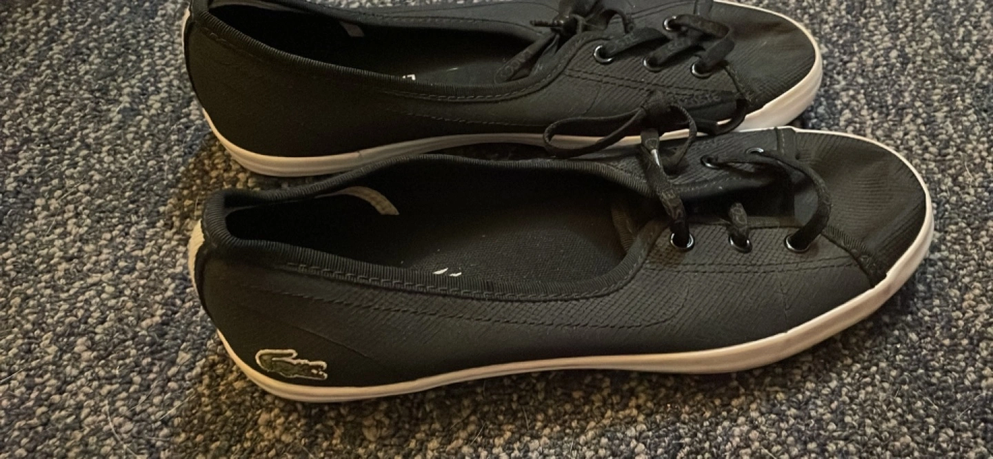 Black sneakers with a white sole. The canvas is black. Lace-up sneakers with eyelets. They are a great pair of shoes for a comfortable walk.