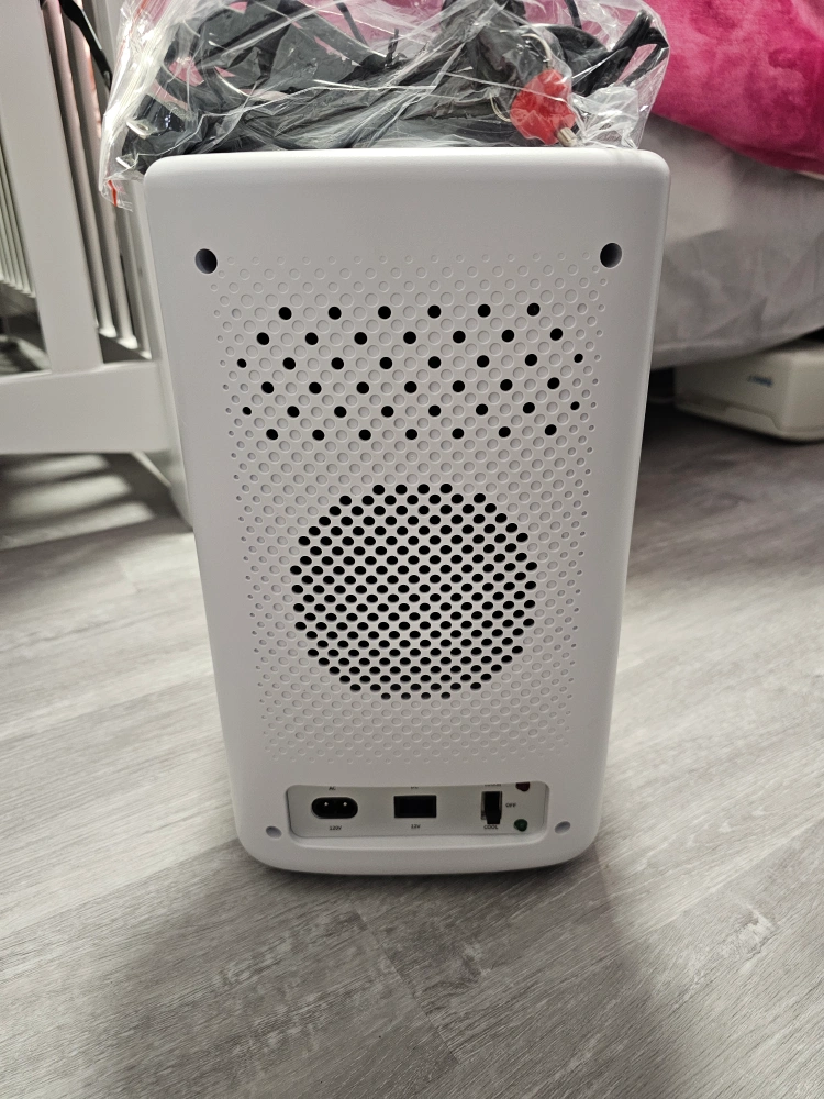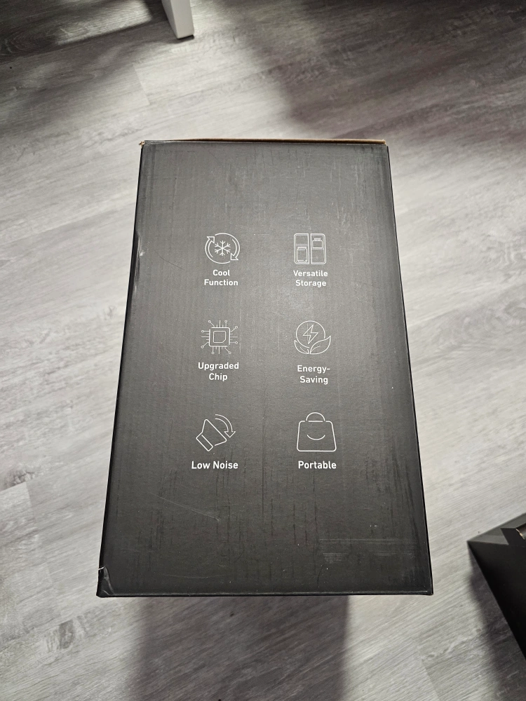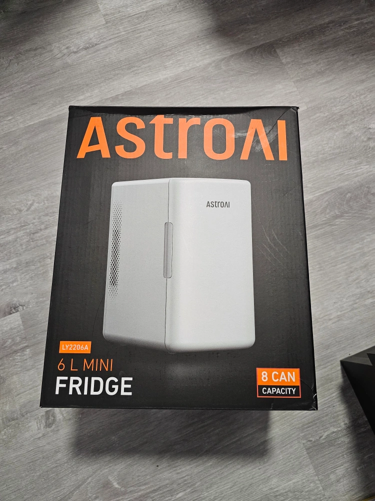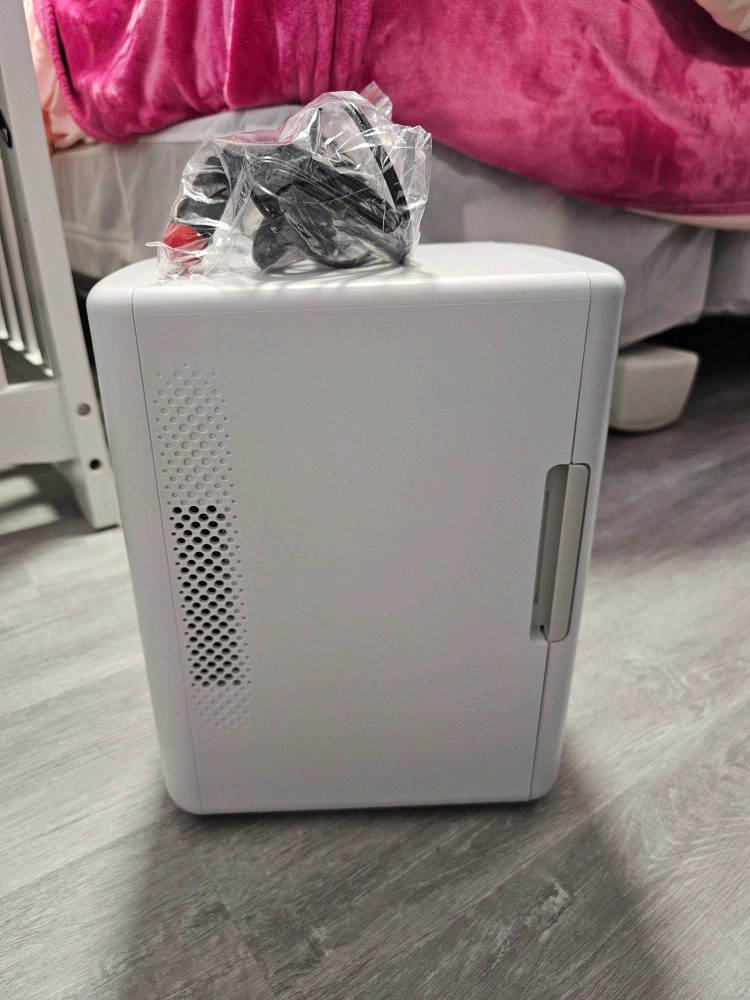 A compact mini fridge, in white. Features a sleek design. The back shows several vents. Comes with a power cord. This fridge can be great for keeping your favourite drinks cold. Holds up to 8 cans