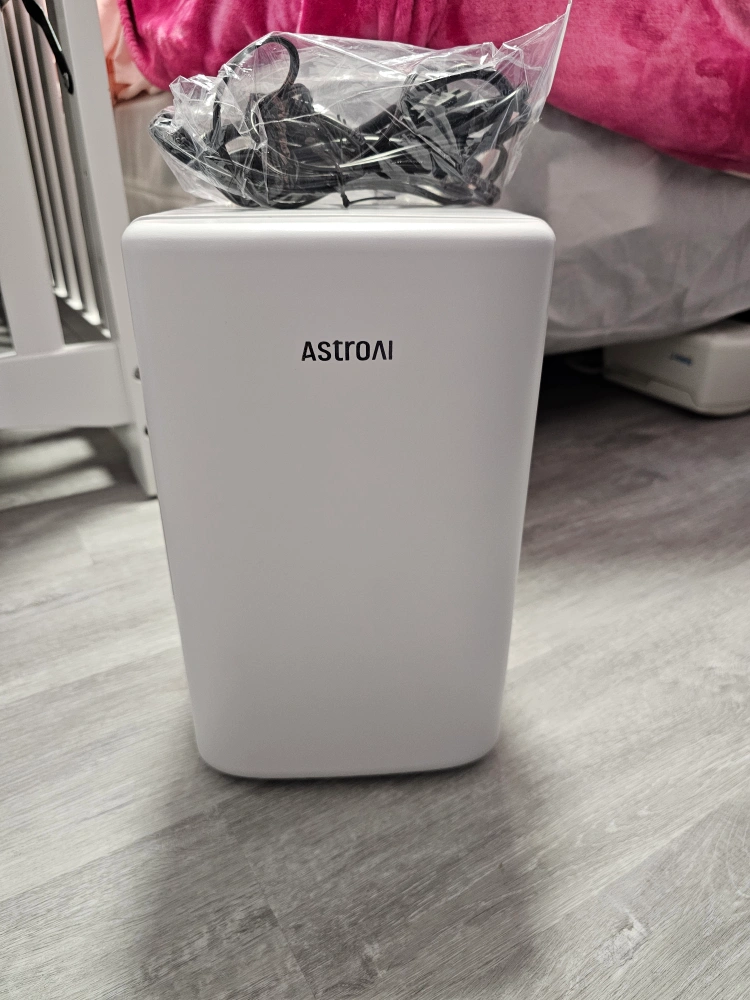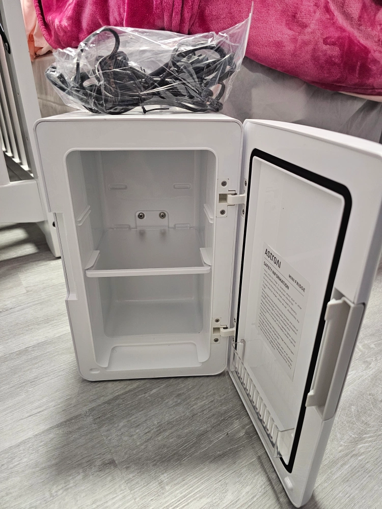 A compact mini fridge, in white. Features a sleek design. The back shows several vents. Comes with a power cord. This fridge can be great for keeping your favourite drinks cold. Holds up to 8 cans