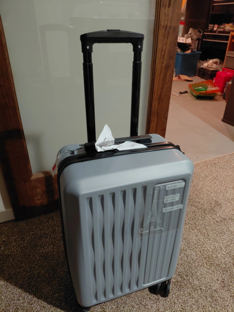 A stylish rolling suitcase. Features a retractable handle. Has a hard shell with a ribbed design. The size is 20 inches. This suitcase would be perfect for carrying your belongings on a relaxing getaway.