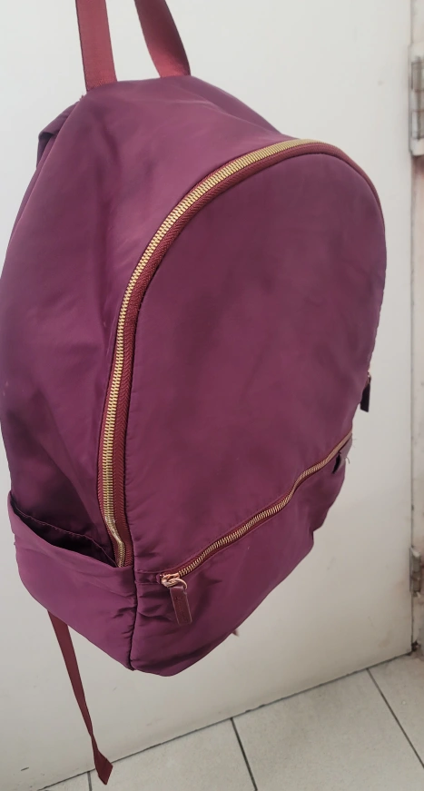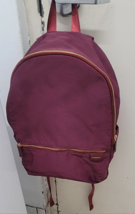 A burgundy backpack, ready for everyday use. Featuring a top handle and adjustable straps, the backpack offers a secure and comfortable carrying experience.