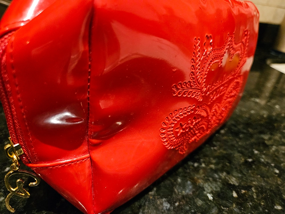 A beautiful red cosmetic bag. Features an embossed design. Has a golden zipper. This cosmetic bag would be the perfect addition to your daily routine, creating a sense of calm as you get ready.
