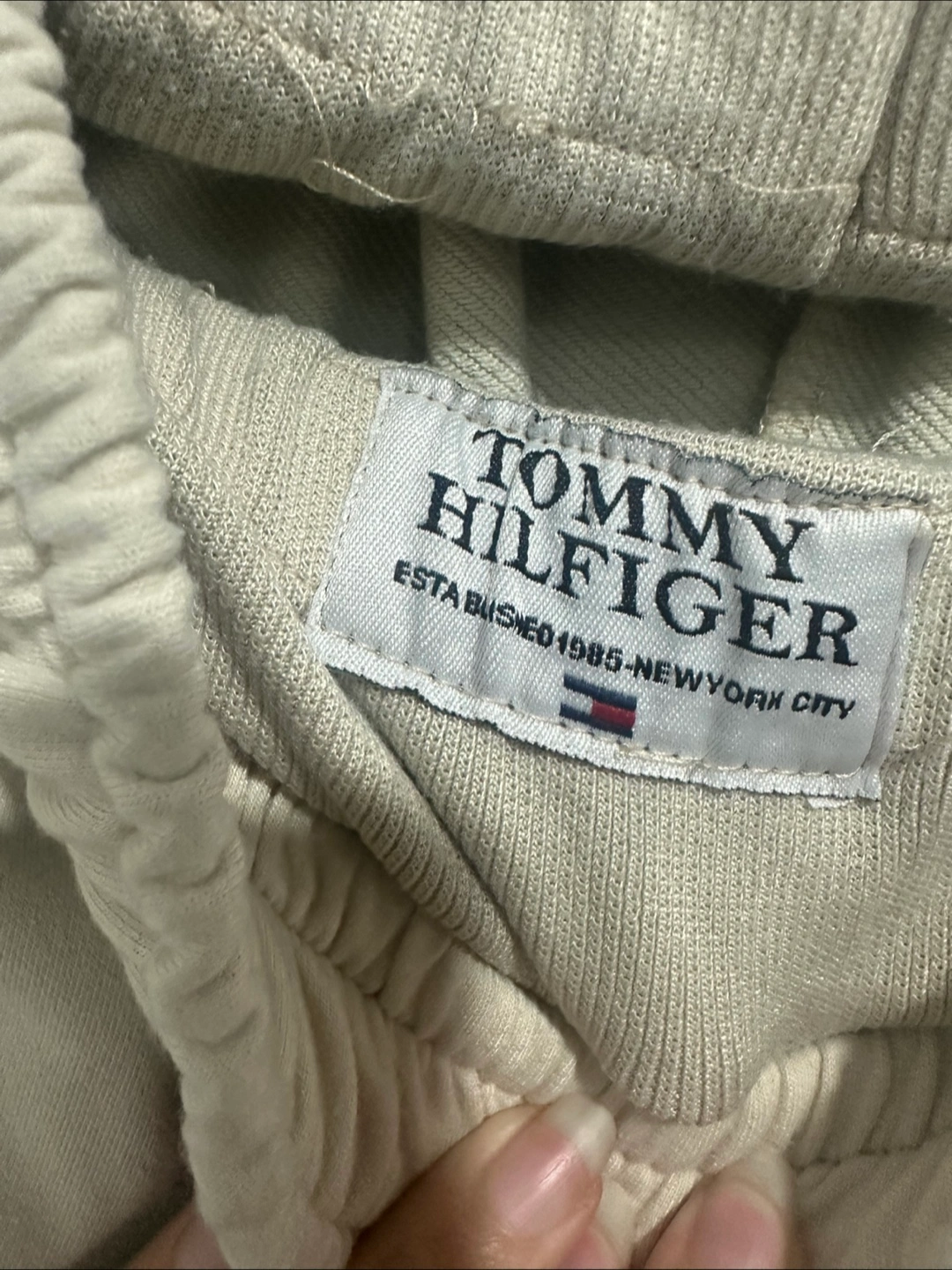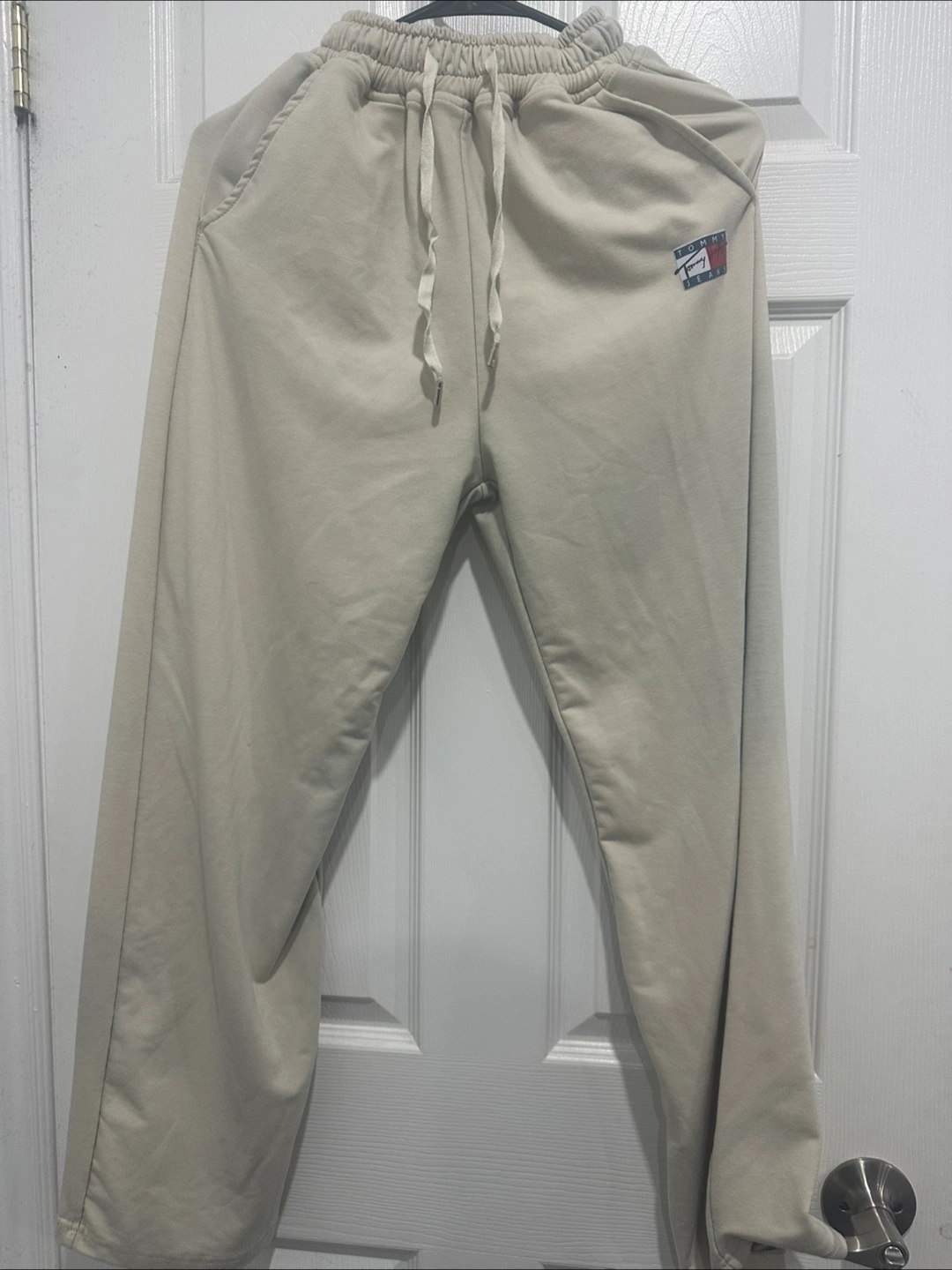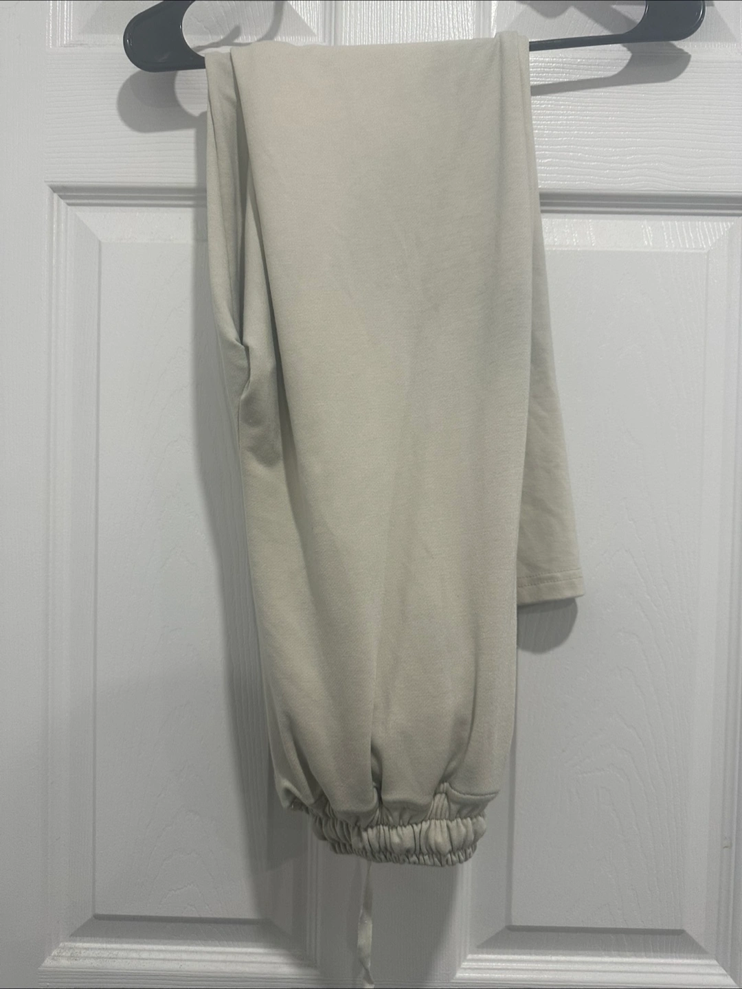 These sweatpants are beige and feature a drawstring. There is a small logo on the side. Pickup near Jarvis and Dundas