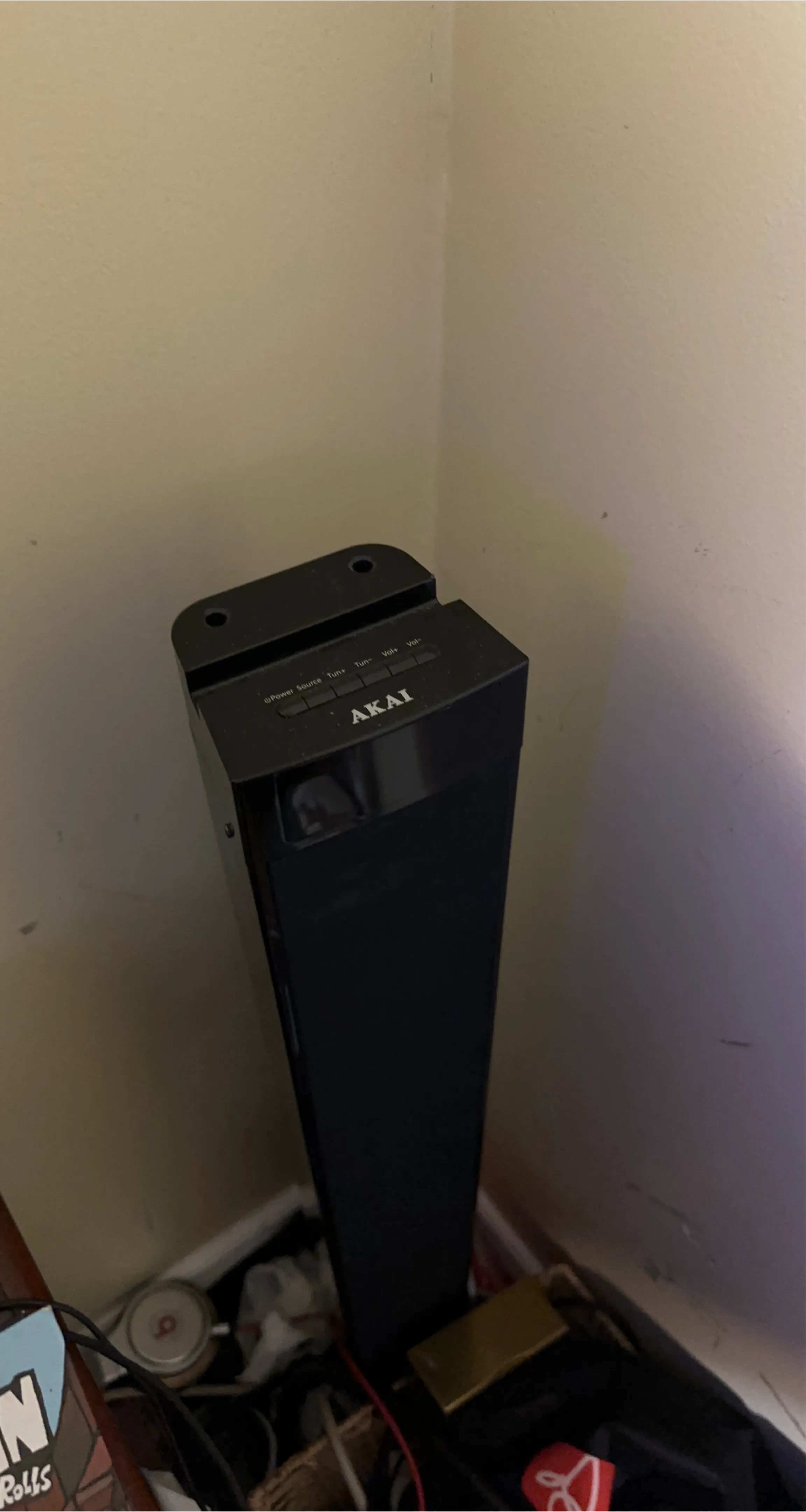 Selling an Akai tower speaker in black. It has a few buttons on top for power, source, tune, and volume. Great for adding some sound to your space. need gone asap