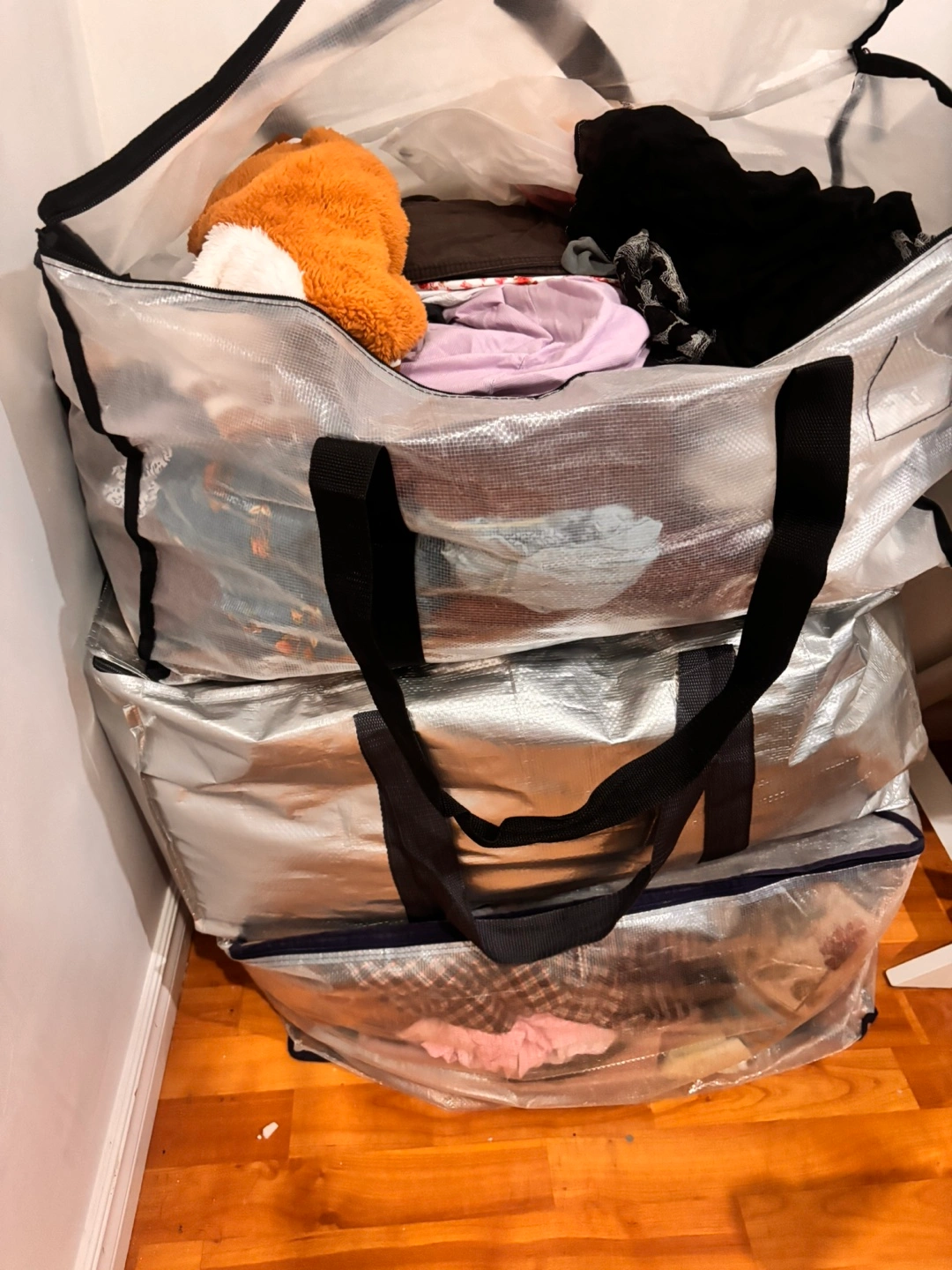 I am selling three bags of gently used women's clothing, all in medium size. The bags contain a variety of items, including pants, shirts, trousers, nightwear, and socks. Some pieces were never worn.