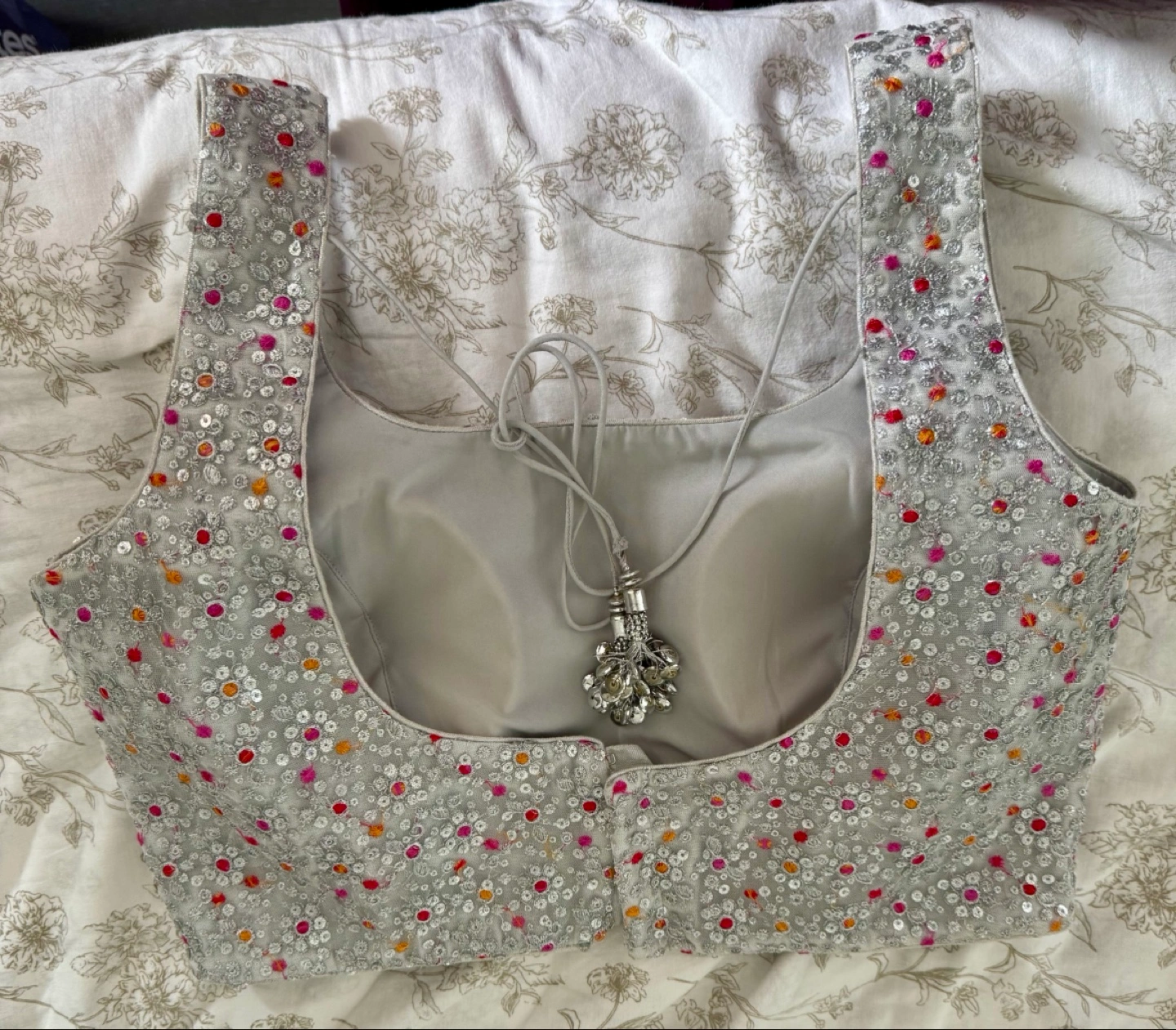 A sleeveless top, featuring a scoop neckline. Embellished with sequins and colourful beads. The back has a tie closure to secure the top. This top would look great worn on a sunny day.