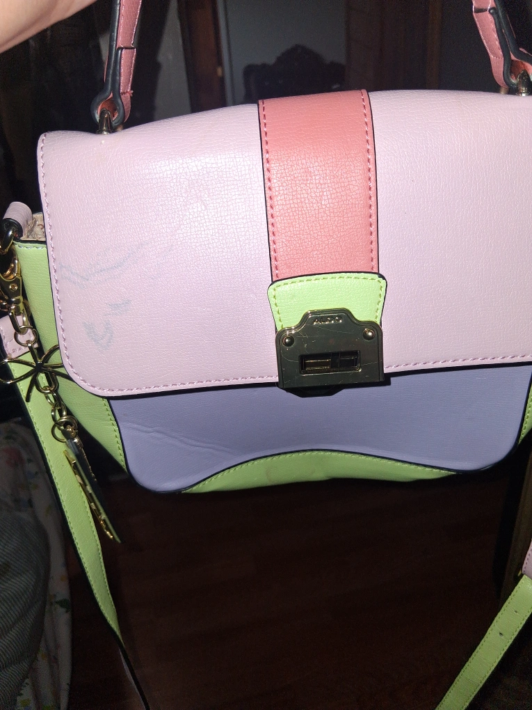 60A colorful handbag with multiple tones and a gold clasp. It has a crossbody strap with golden chain details. Perfect for carrying your essentials in a stylish way; it's great for all your needs.