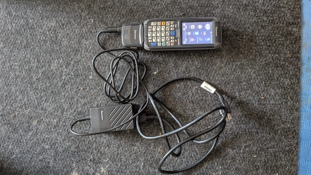 Mobile computer with a touch screen display, along with a variety of function keys and a number pad. Comes with a stylus and is complete with a charging dock and cable.
