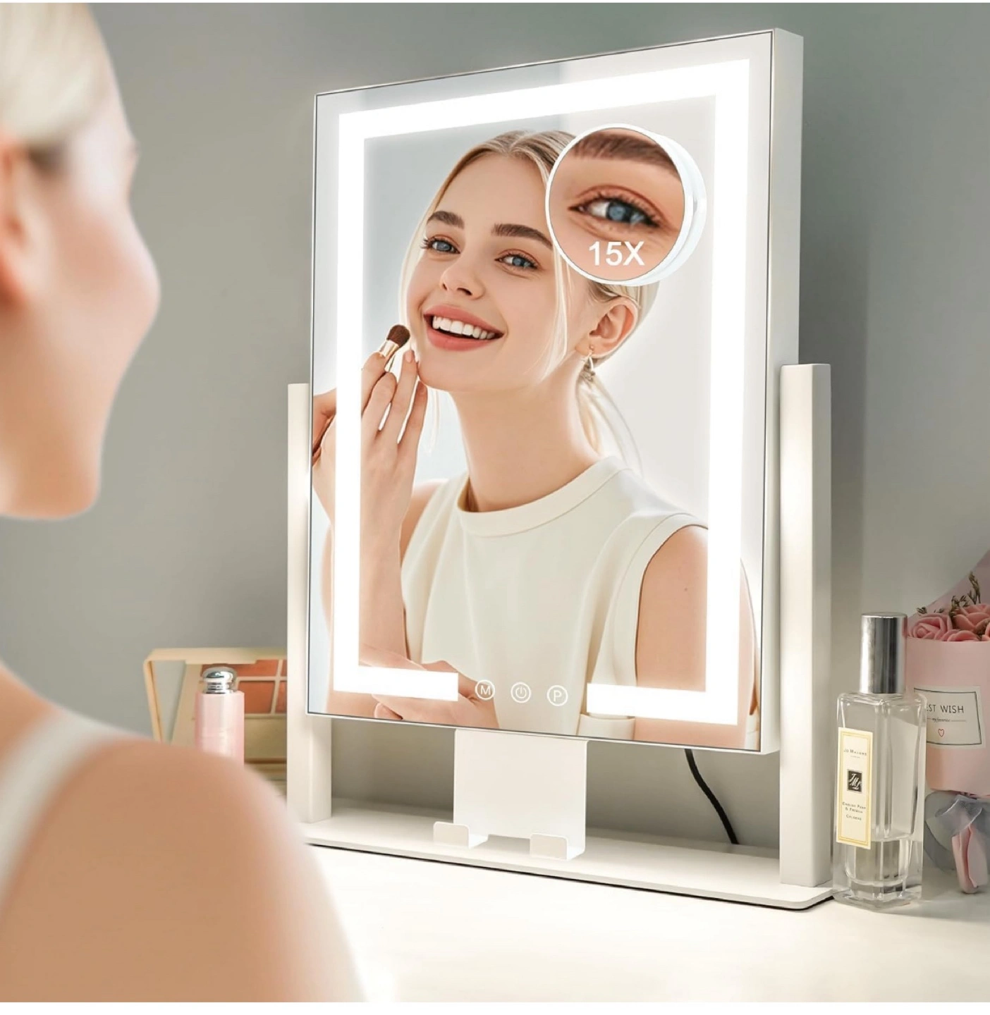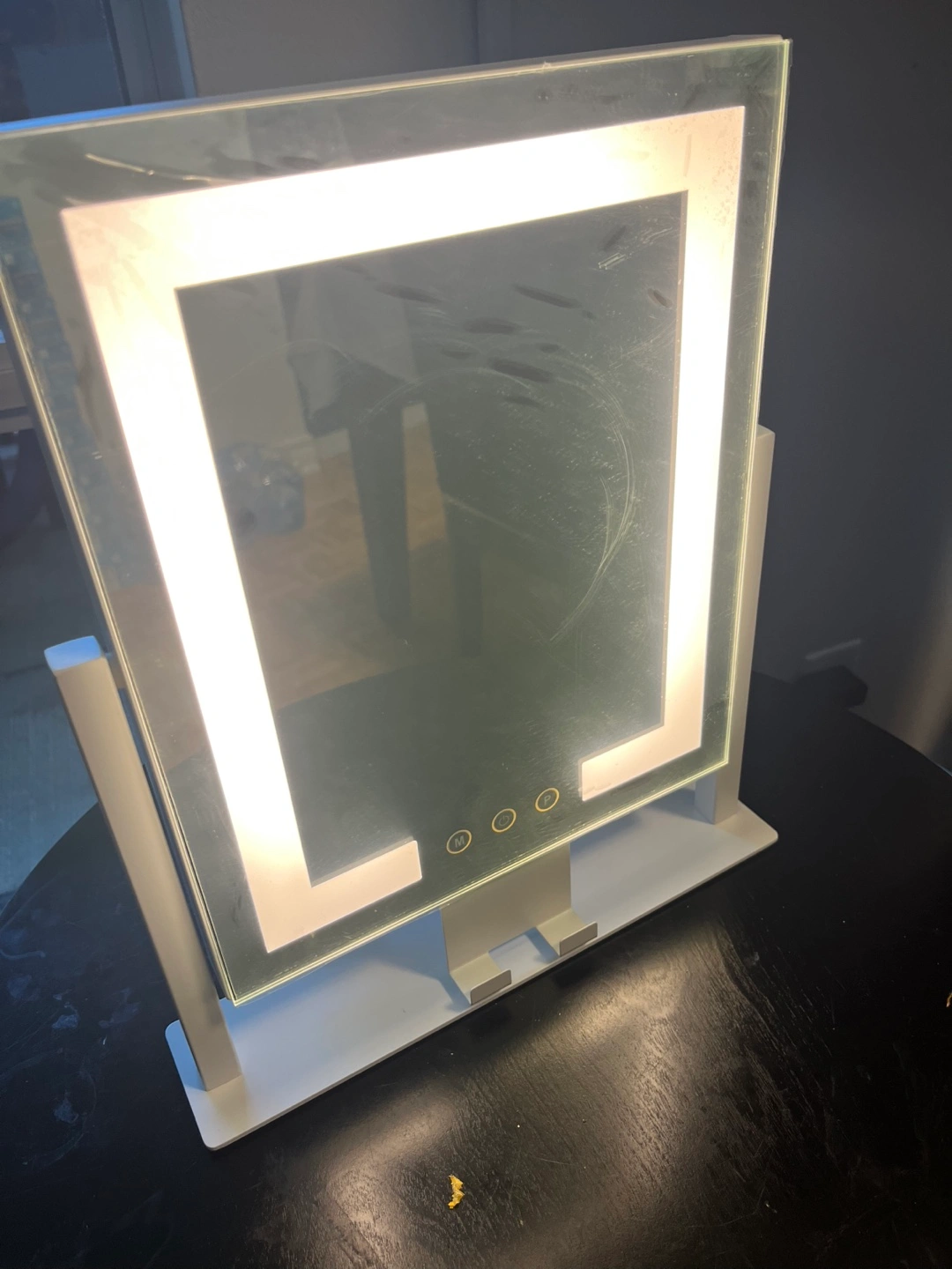 I'm offering an illuminated makeup mirror. It has a square shape with an illuminated border. It stands upright on a base. It also has buttons to control the lights. You can use this to achieve the most perfect makeup look.