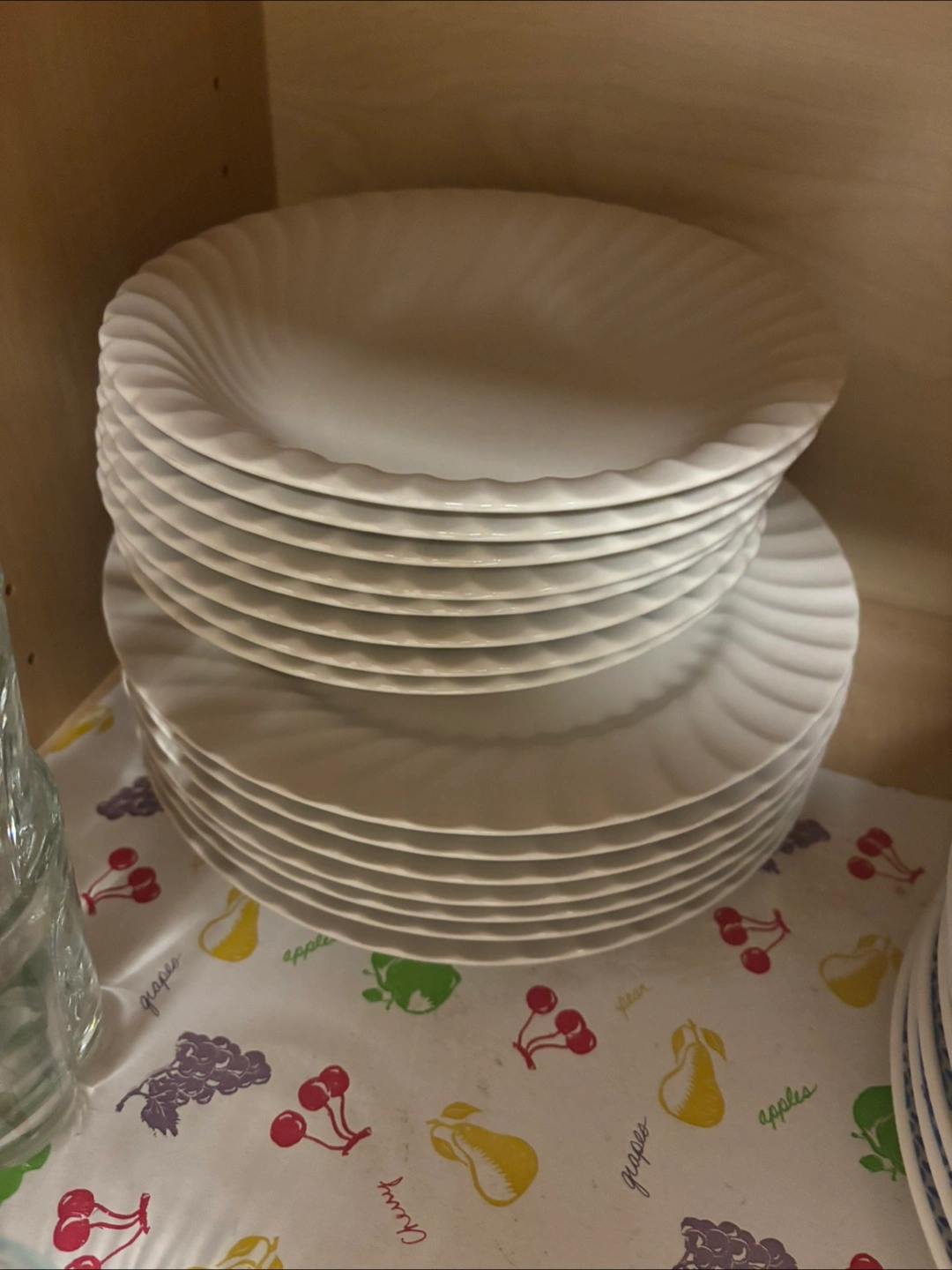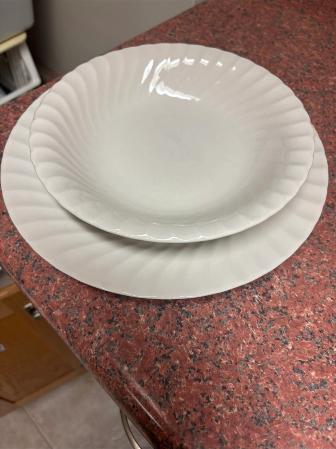 The plates are white. There are multiple plates in this set. The plates have a textured design. Setting the table will become a joy with these.