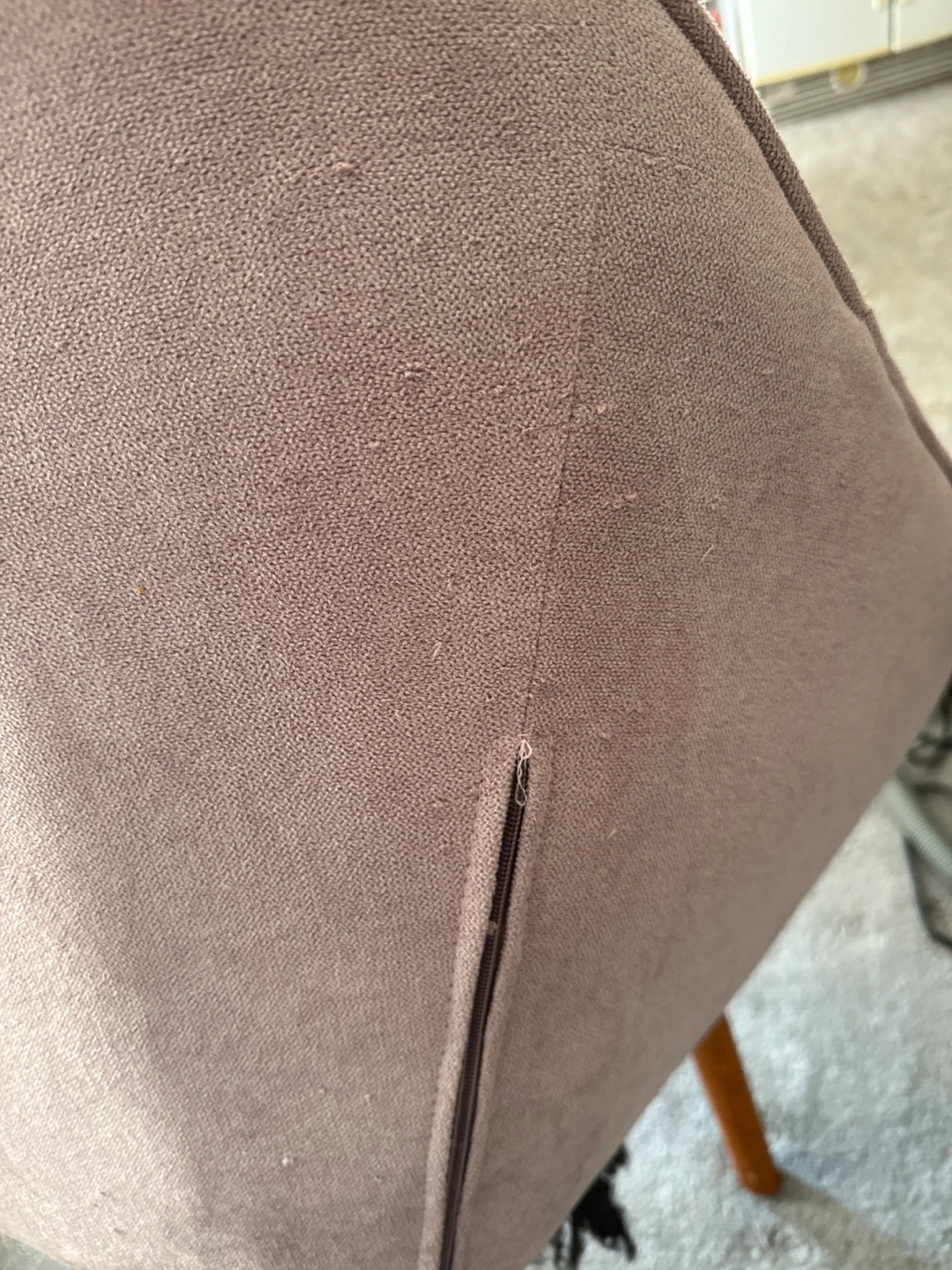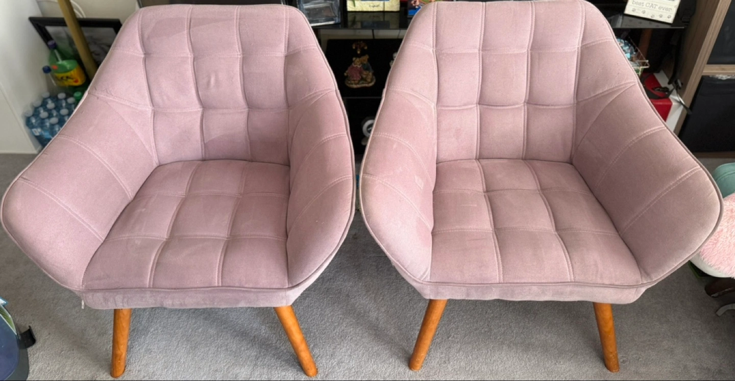 Pair of stylish chairs in a soft pink hue. Upholstered in a textured fabric. Featuring wooden legs for added stability. A perfect place to sit and enjoy your morning coffee.