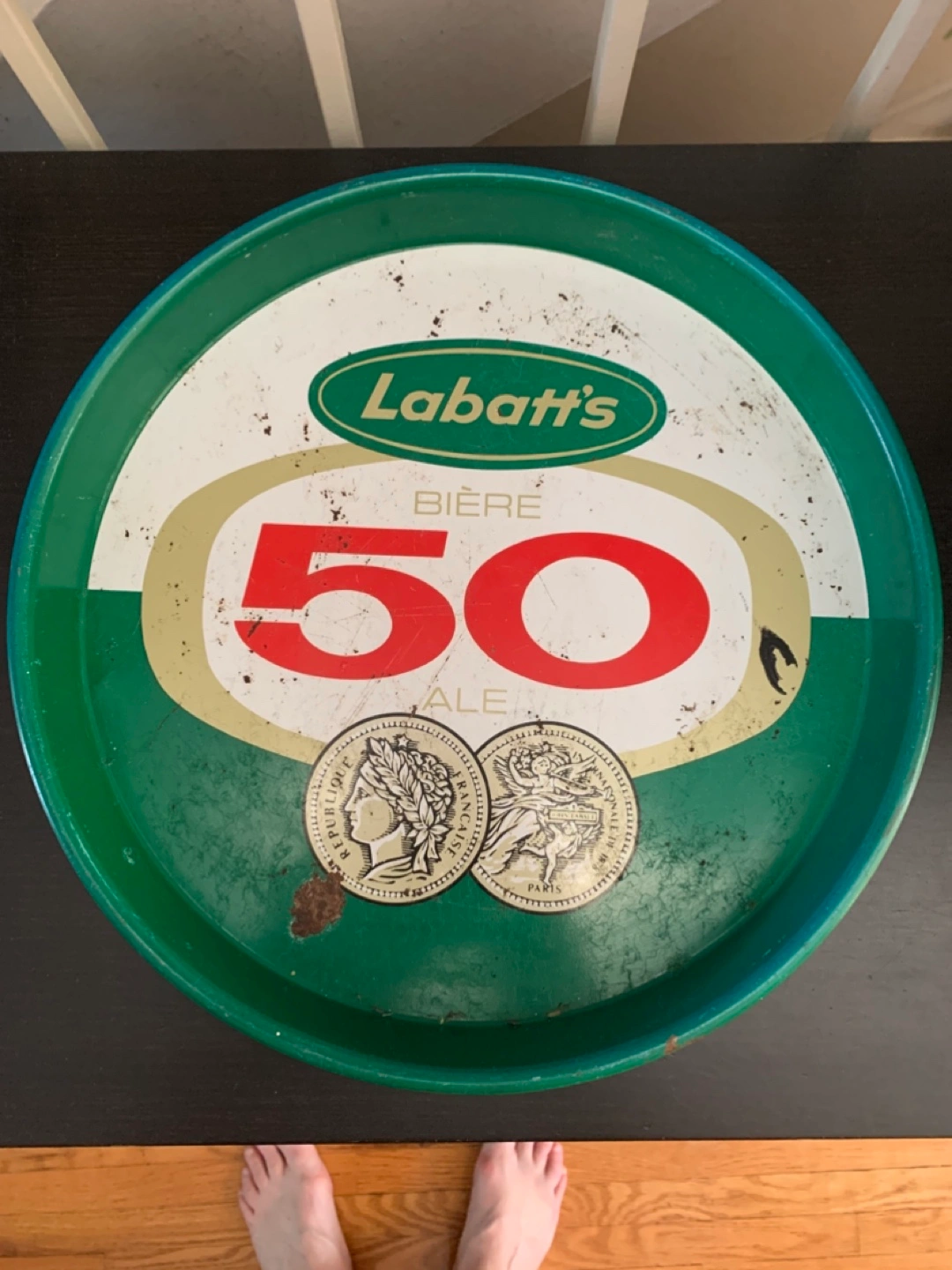 Vintage round metal tray advertising Labatt’s 50. It’s a little worn, as you can see, but still sturdy and fun. Diameter is 12 inches and its height is 1.5 inches.
