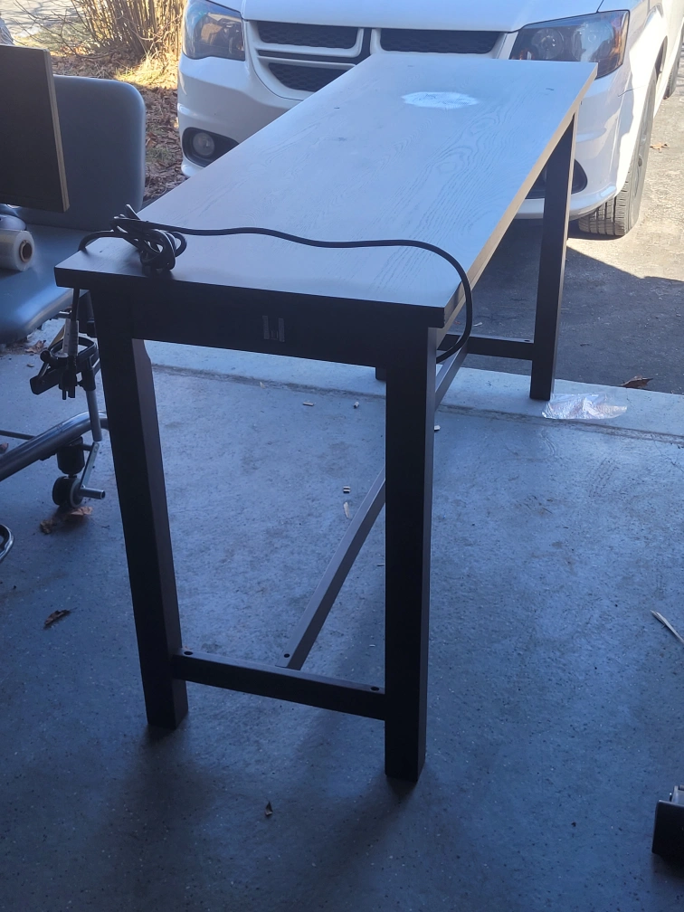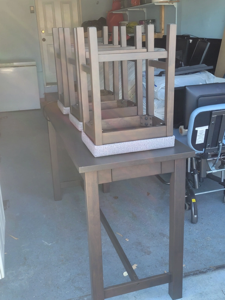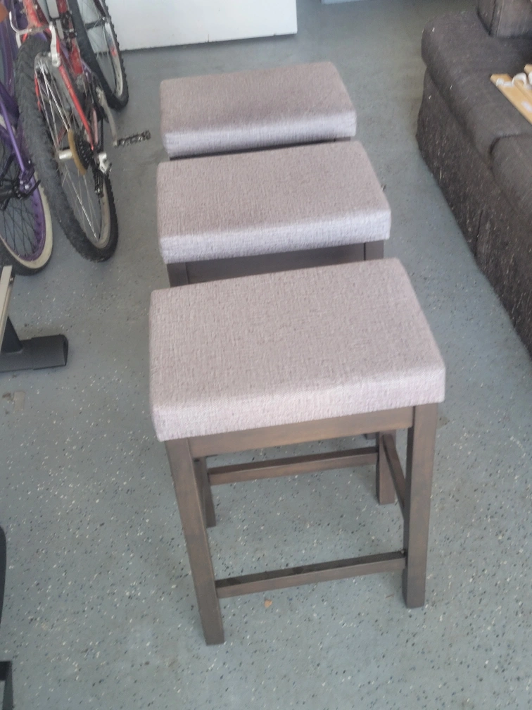 QUICK SALES. $120. A table, featuring a dark wood finish. It includes three stools. The stools have cushioned seats and wood legs. I think you will find this set a great place for a cup of coffee in the morning.
