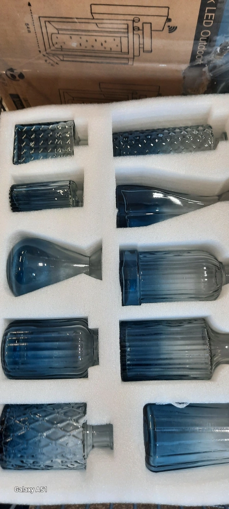44A set of decorative glass vases in a variety of shapes. Various textures, patterns, and shades of blue. These vases can be displayed as is to elevate any room. The vases are a beautiful addition to any living space. Great for bridal and baby shower decor