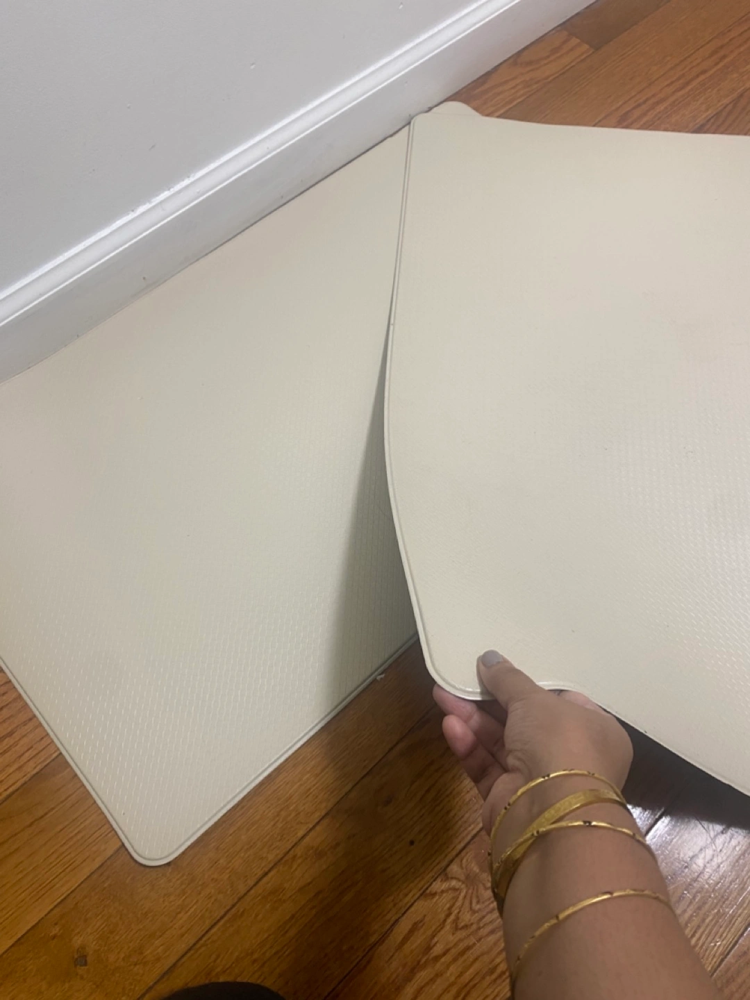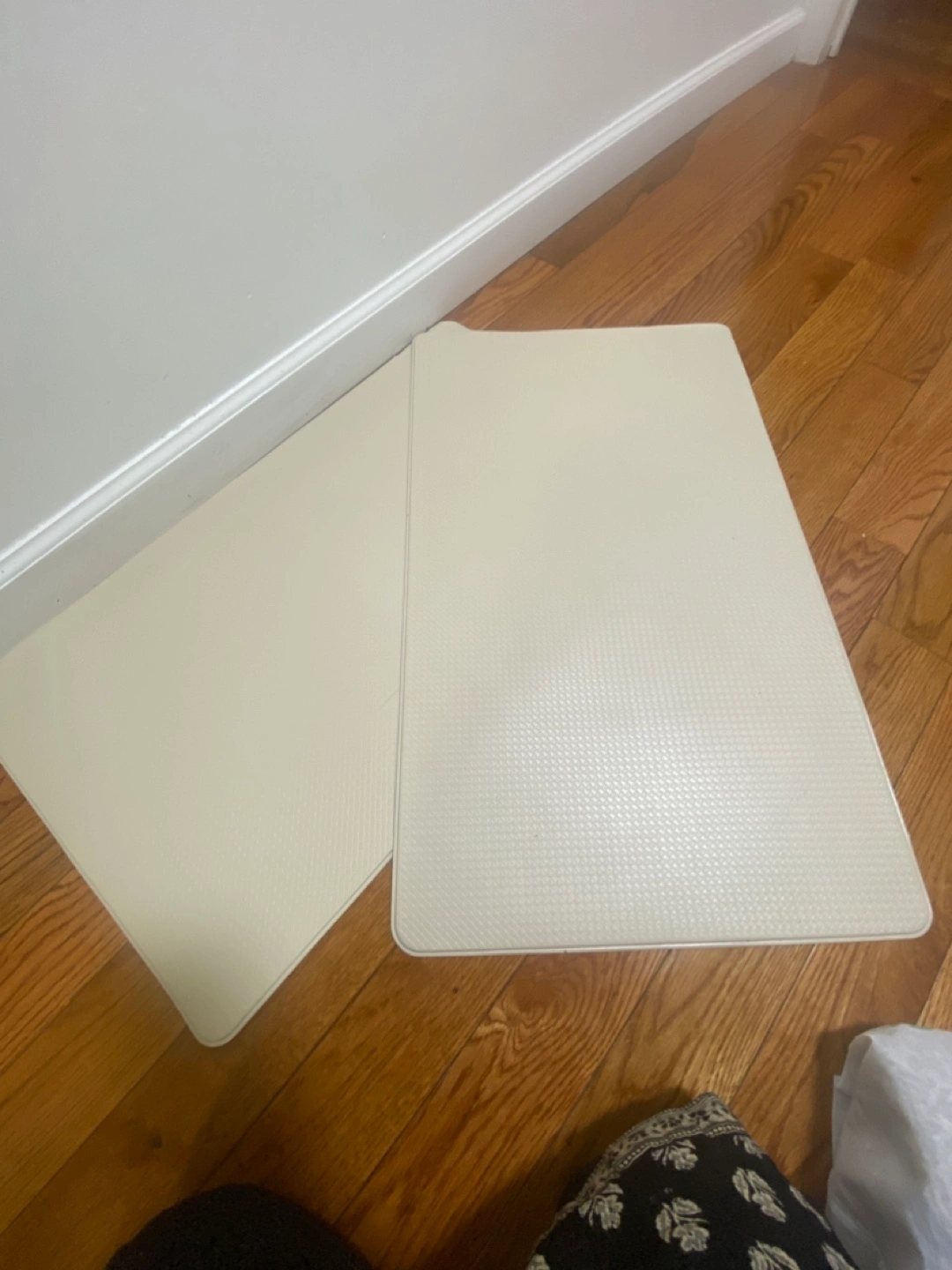 Floor mats in a creamy beige color. Notice the textured design. Perfect for adding a touch of comfort to your living space. I have two of them each one of them is $5 two for $10