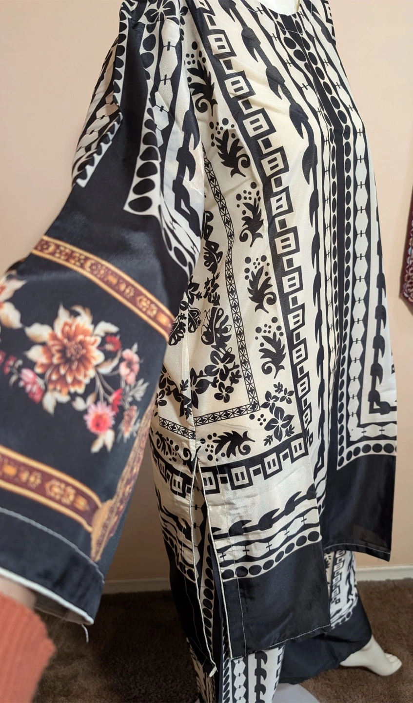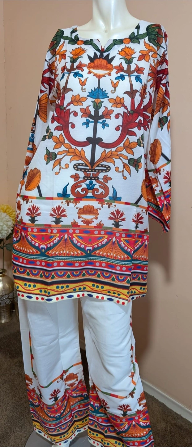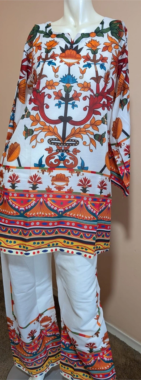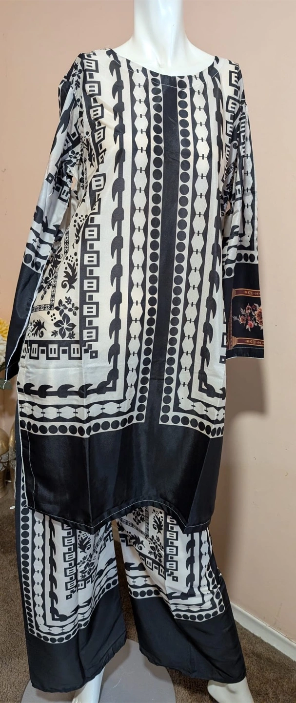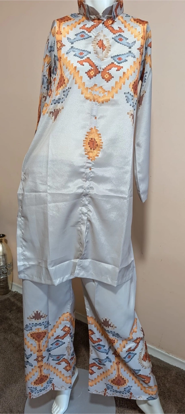 87Beautiful two-piece set. Features a detailed print throughout. Includes a top with long sleeves and loose pants. This outfit would be great to wear while relaxing at home.also u can go out for dinner or chilling