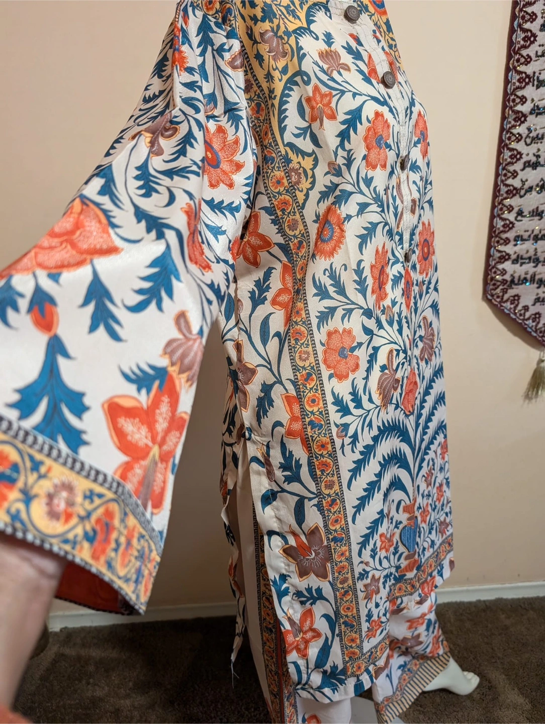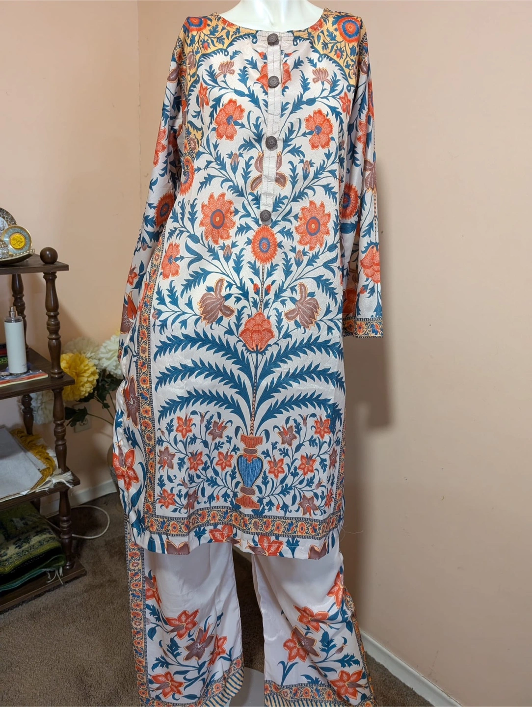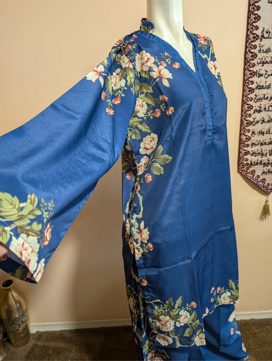 87Beautiful two-piece set. Features a detailed print throughout. Includes a top with long sleeves and loose pants. This outfit would be great to wear while relaxing at home.also u can go out for dinner or chilling