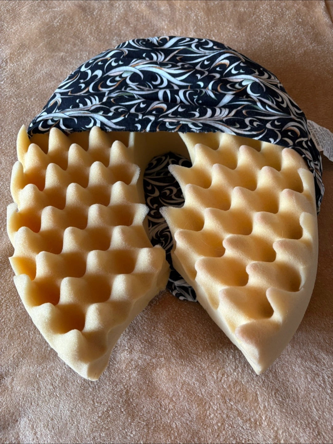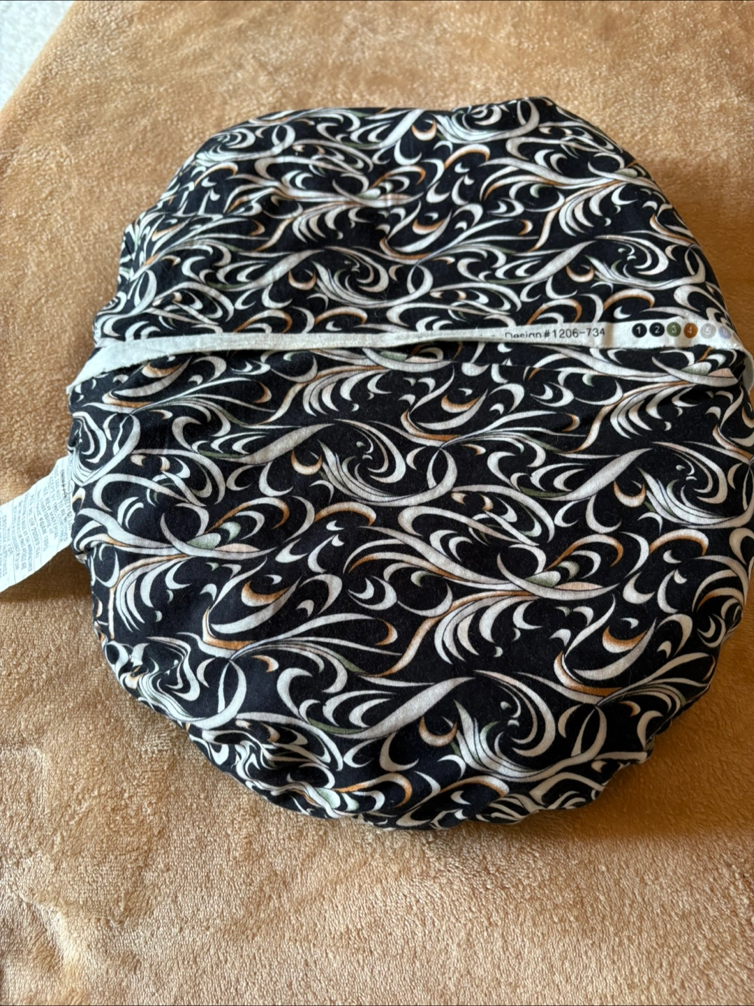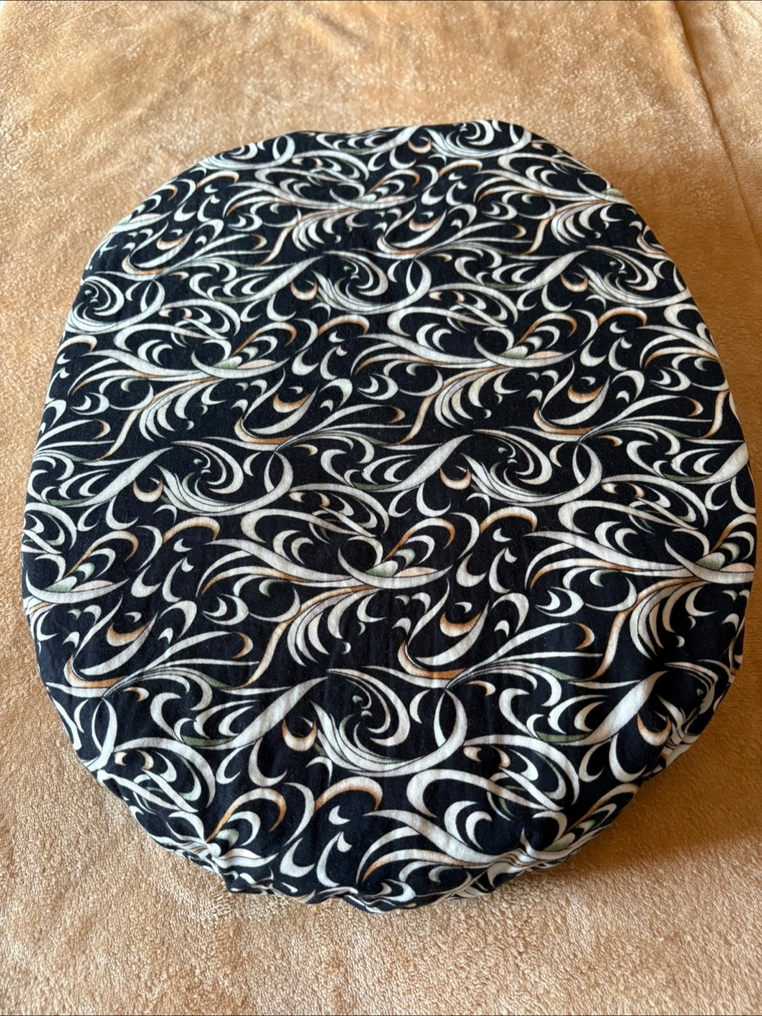 This seat pillow features a removable patterned cover. The cover features a swirling black and white design. The pillow is a light colour. It can be a relaxing experience to use this item.