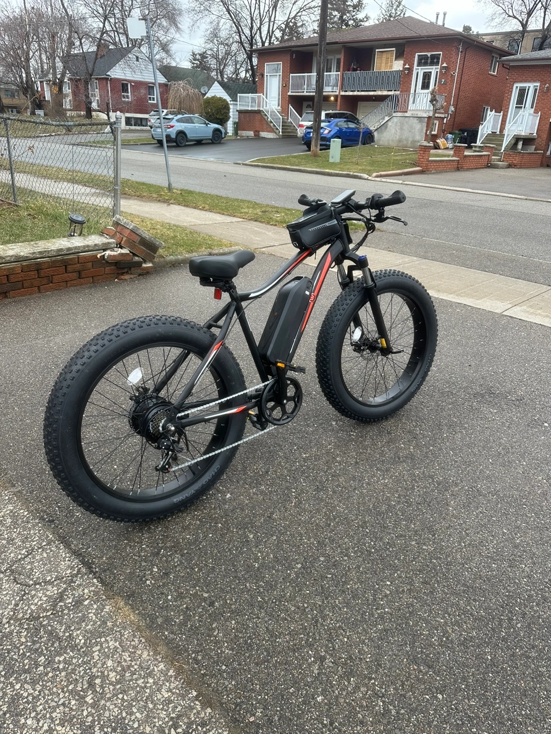 Black electric bike. Features wide tires and digital display. Includes a black storage bag. Going on leisurely rides is a fantastic way to unwind.