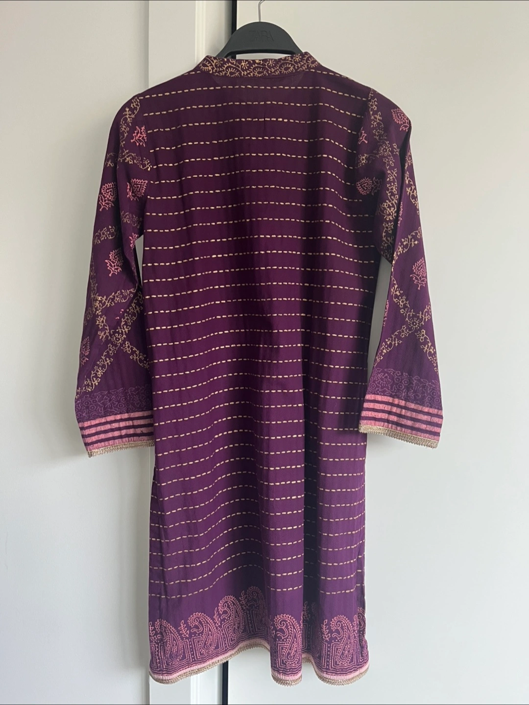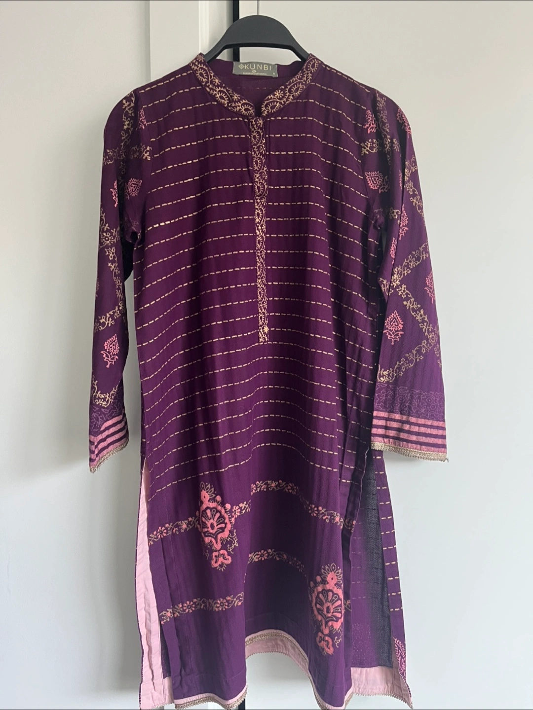A beautiful kurta in a deep purple hue. Features gold and pink print. Long sleeves with decorative cuffs. No stains or tears but the print is faded in some areas (see photos)