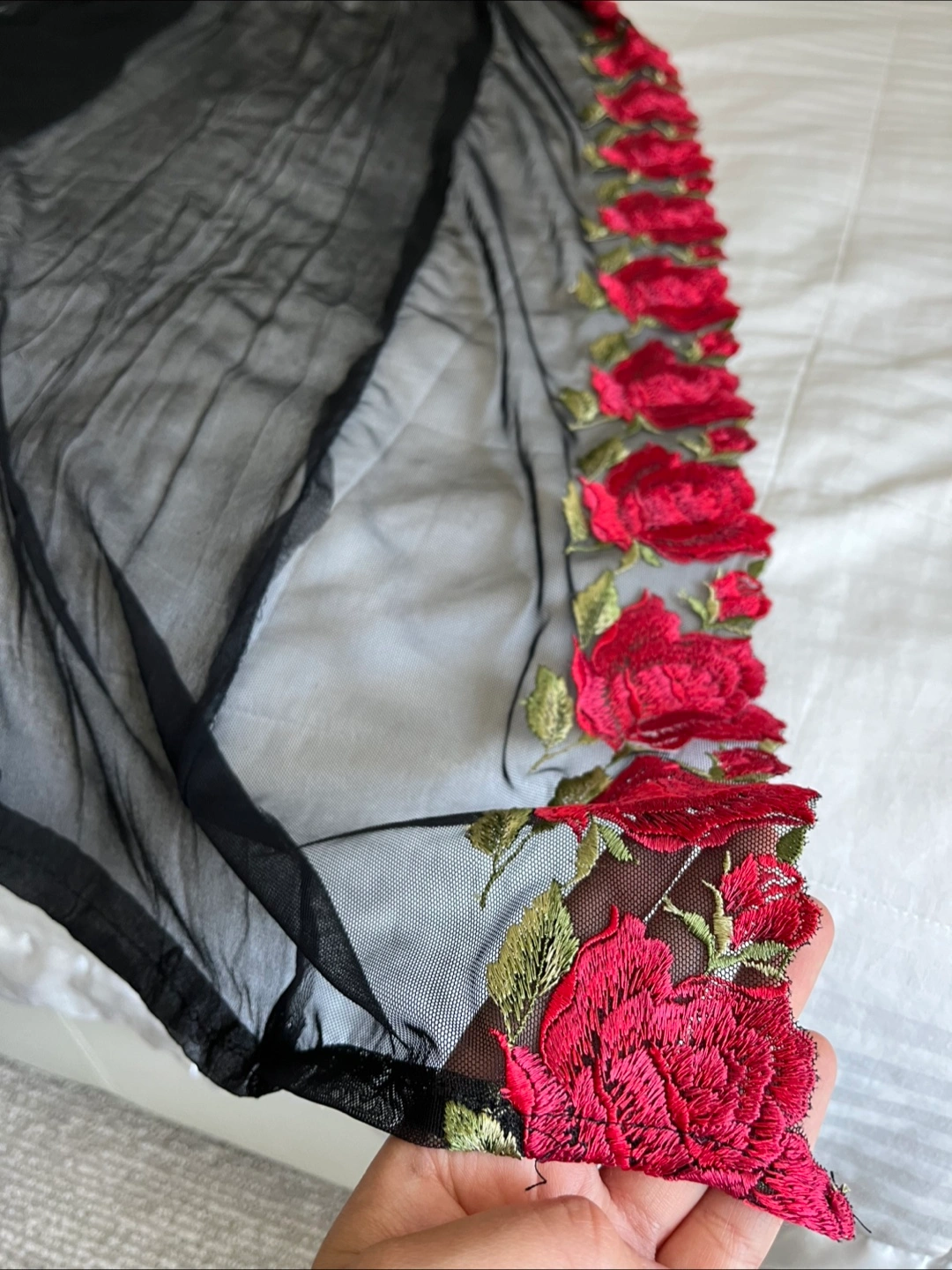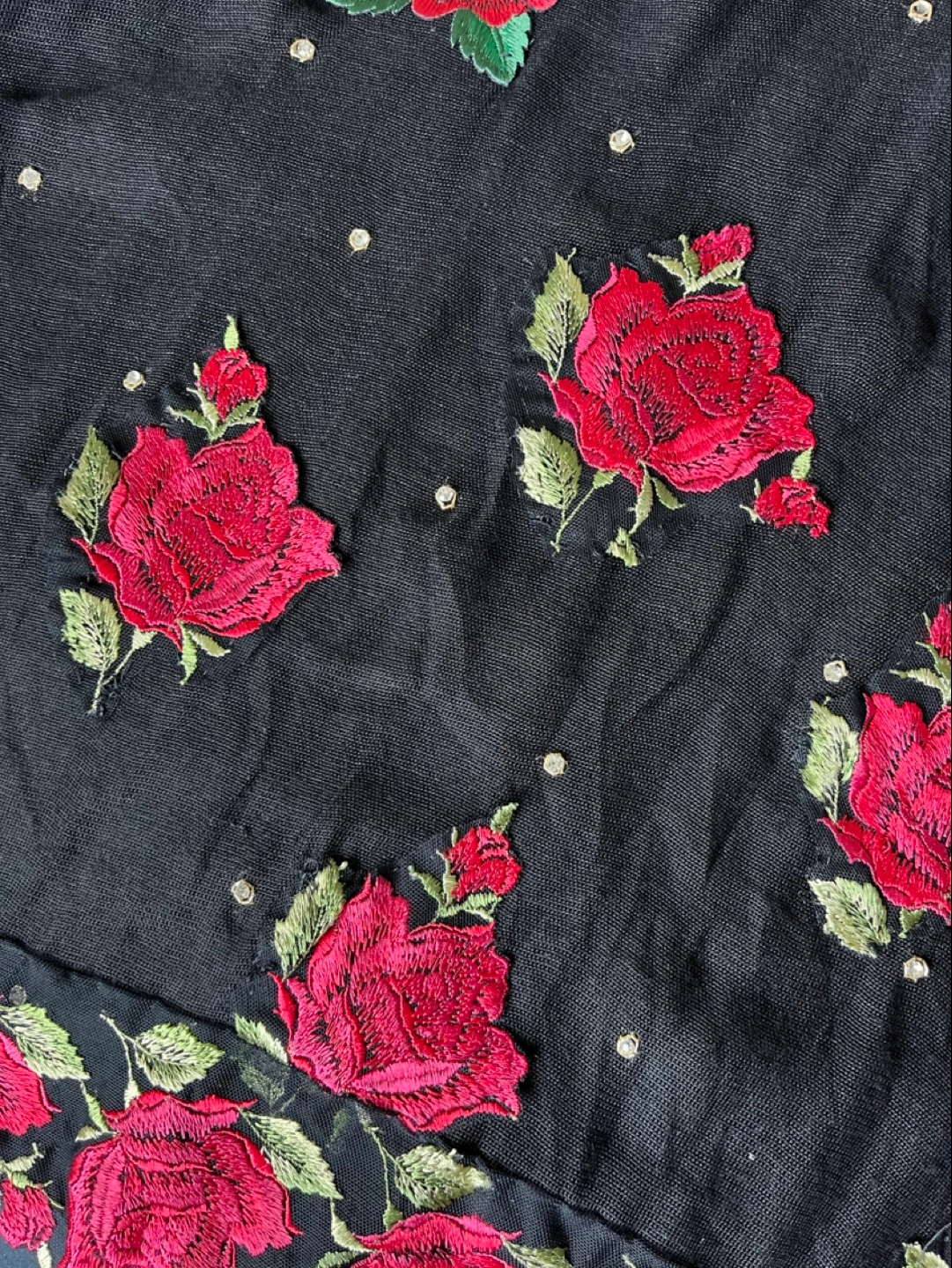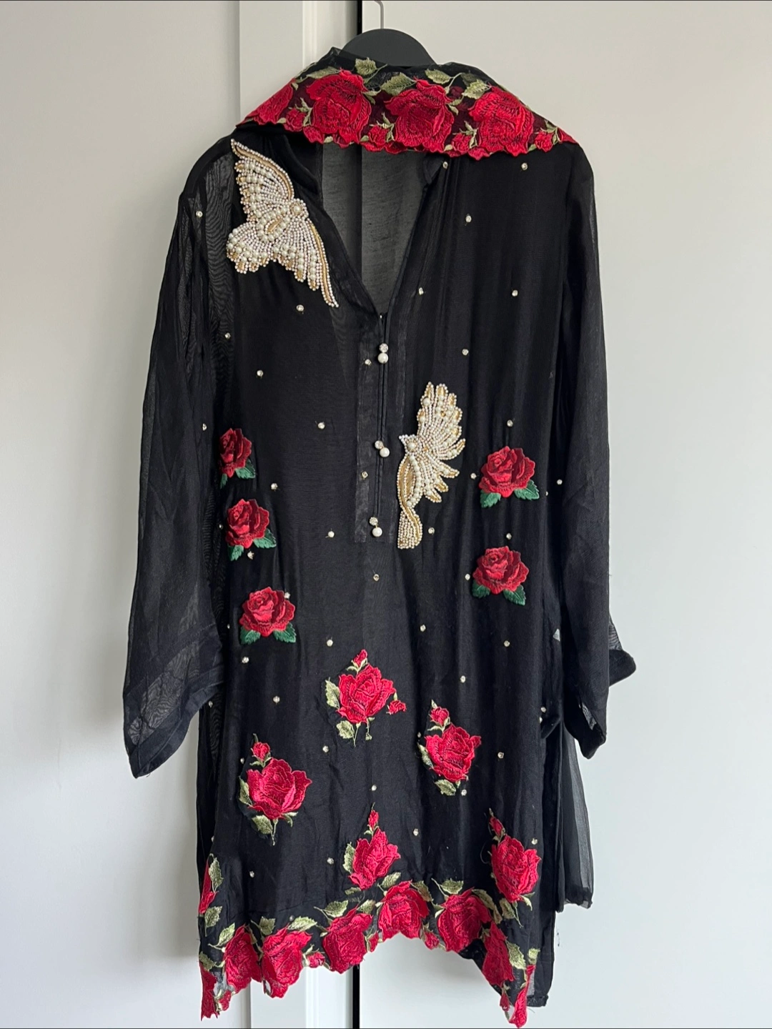 The matching rose dupatta was DIY, as seen in photos, but goes together as a set very seamlessly, same material as the short. Love this piece but just decluttering and hoping it goes to a nice home.