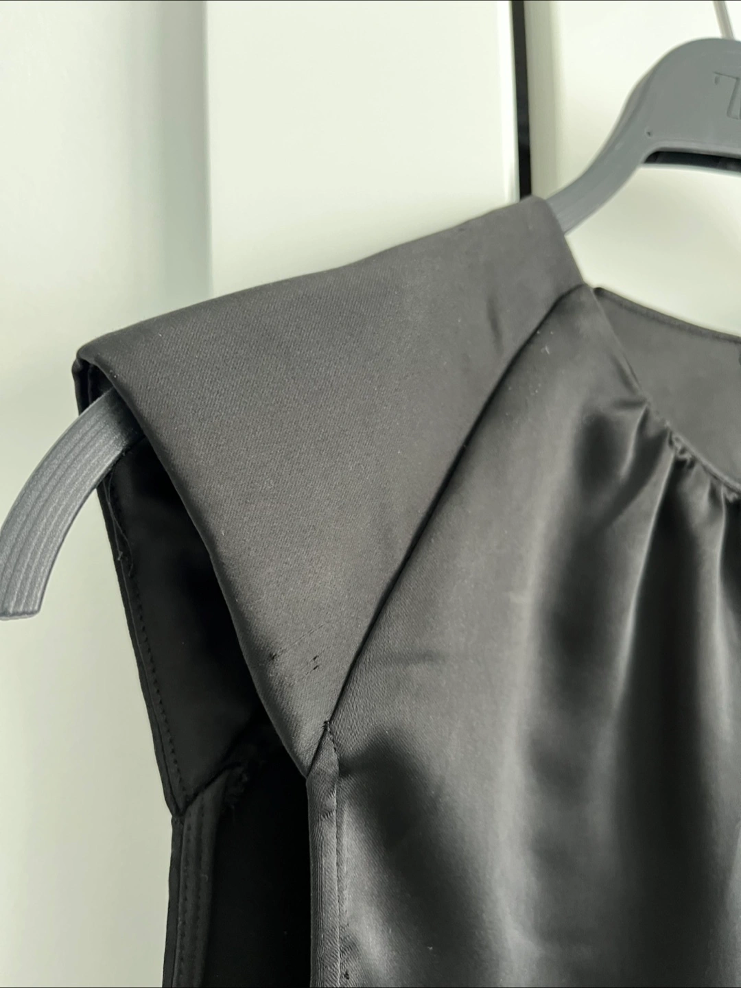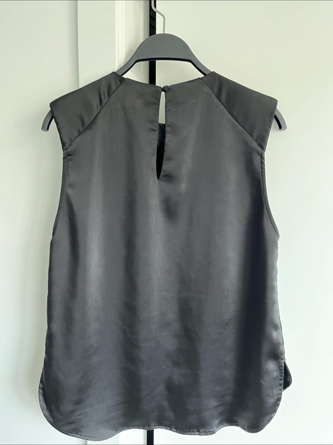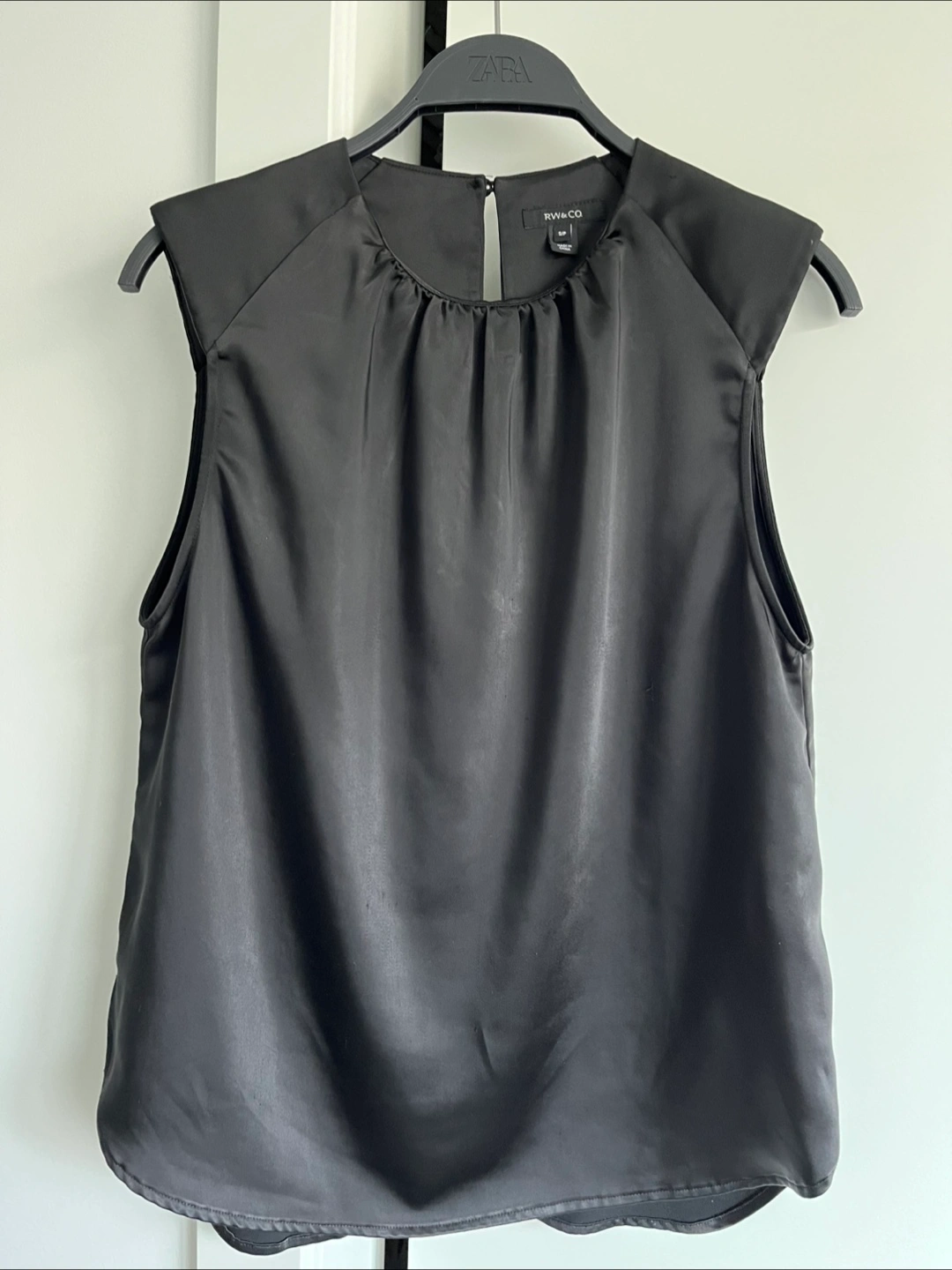 A black sleeveless satin silky top. Features light shoulder pads. A small opening at the back. Perfect for a work outfit.