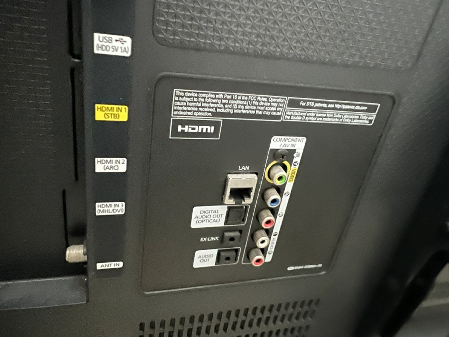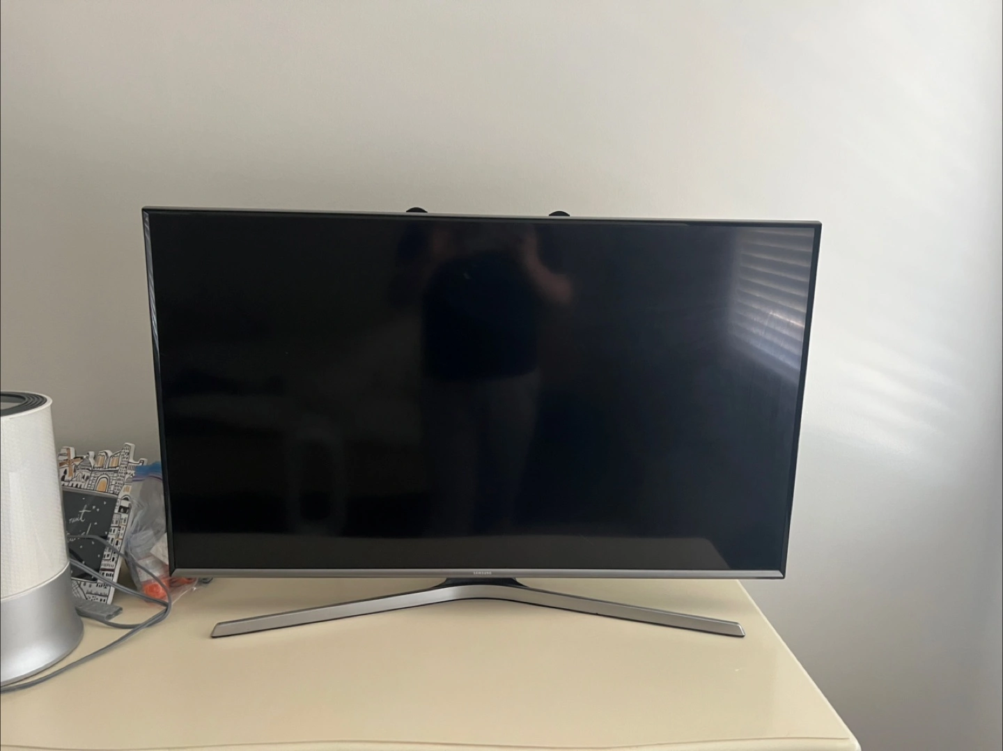 A sleek TV with a wide screen. It has multiple ports for all your devices. It is the perfect item for a relaxing movie night.