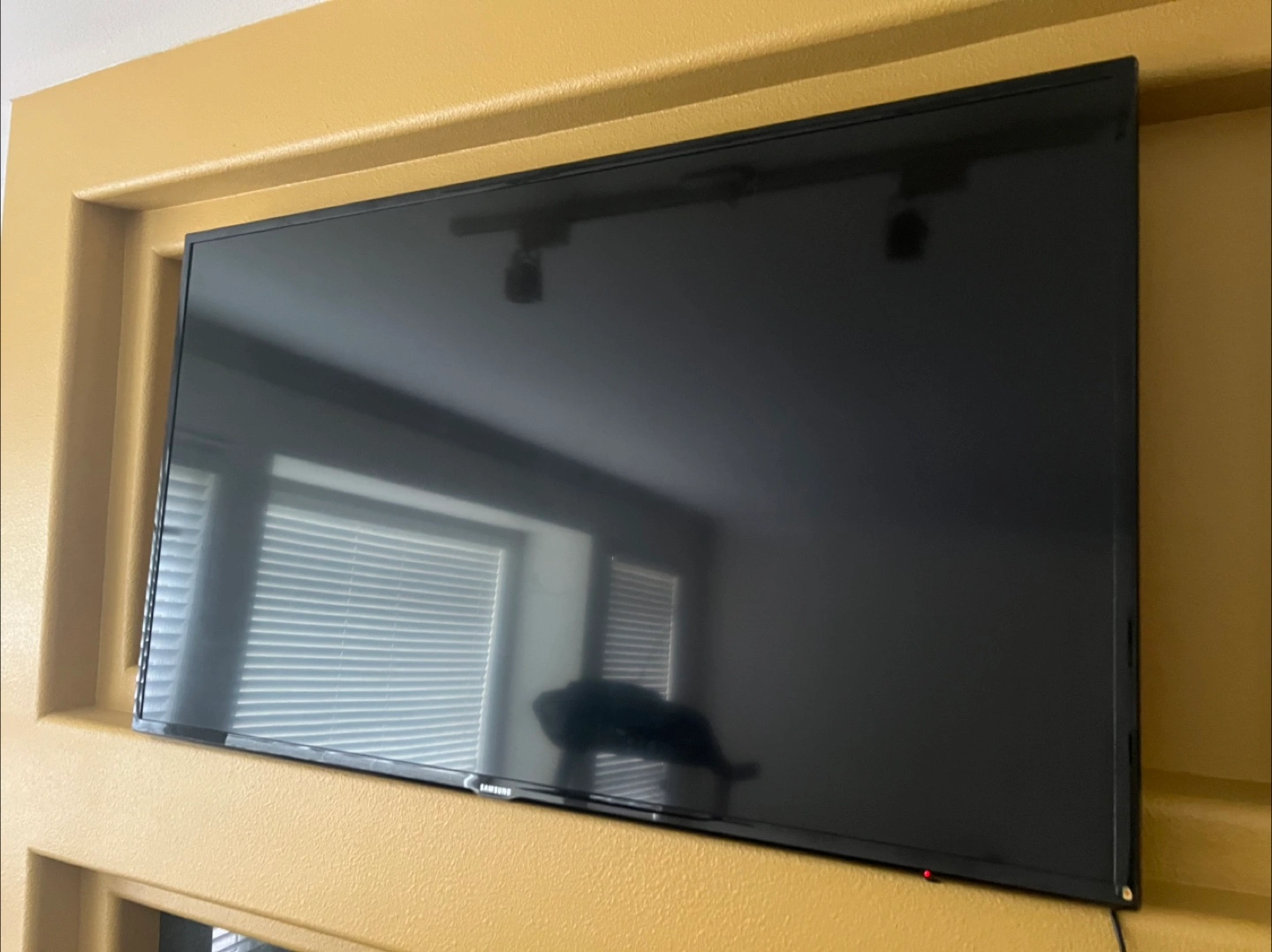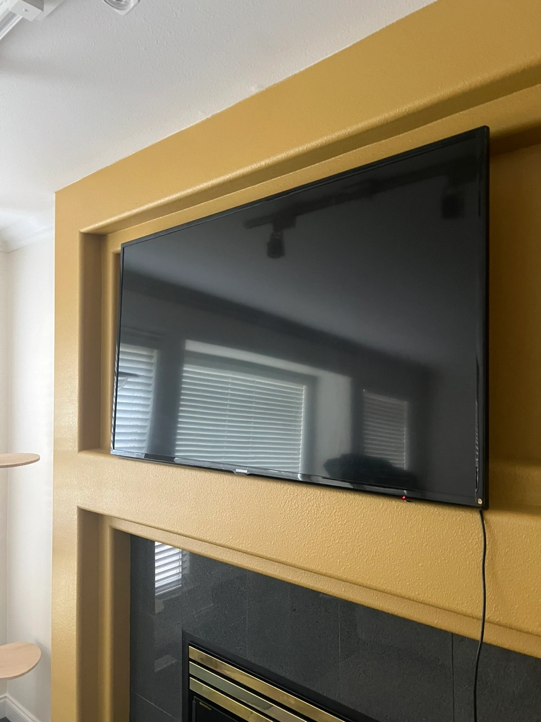 A flat screen TV, perfect for relaxing and watching your favourite shows. Mounted on a wall. Features a black frame. Includes a power cable.