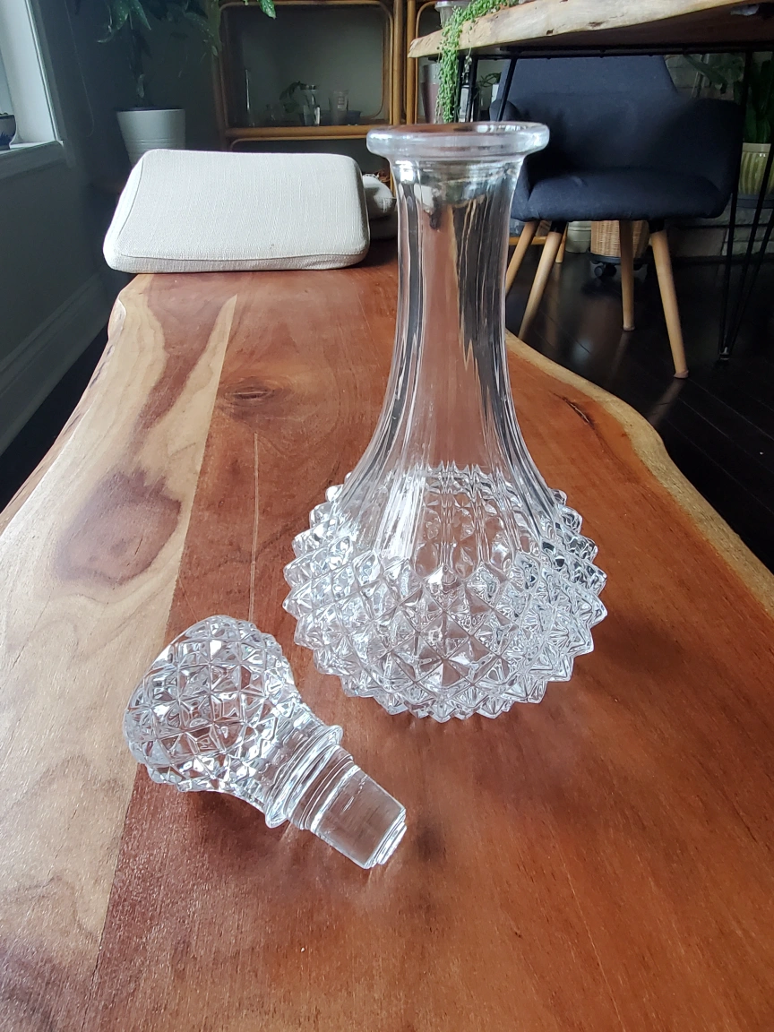 A clear glass decanter. Features a textured, faceted design. The stopper is included. A perfect piece for a little bit of joy and elegance in your home.