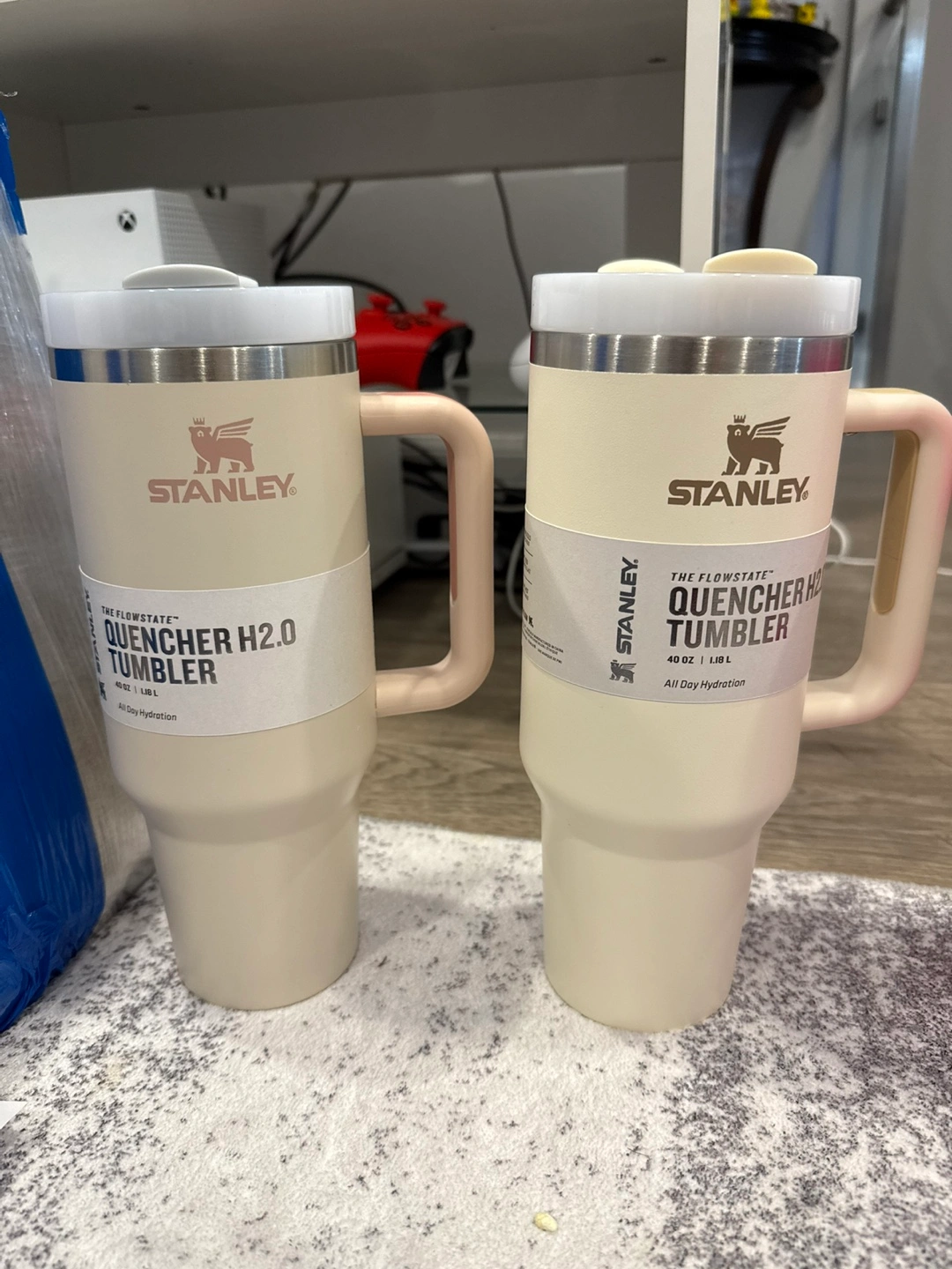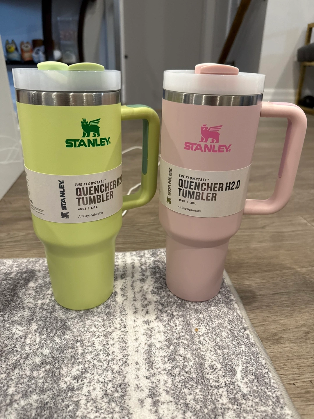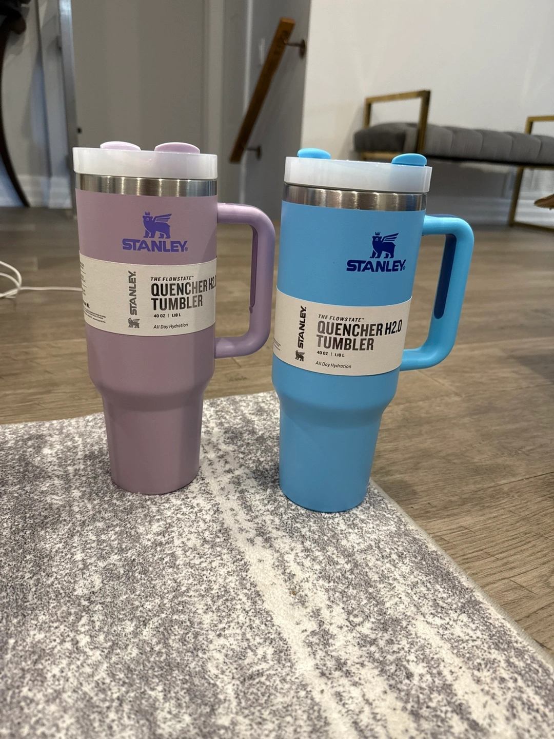 A collection of Stanley tumblers. Each tumbler features a handle. The tumblers are available in a variety of colours, and all include lids. Consider taking these with you to stay hydrated throughout the day.